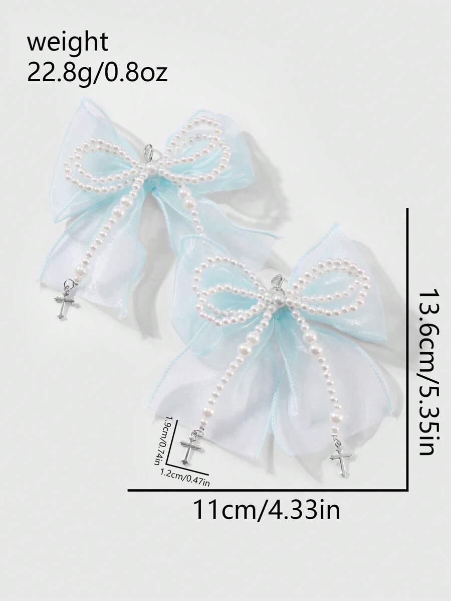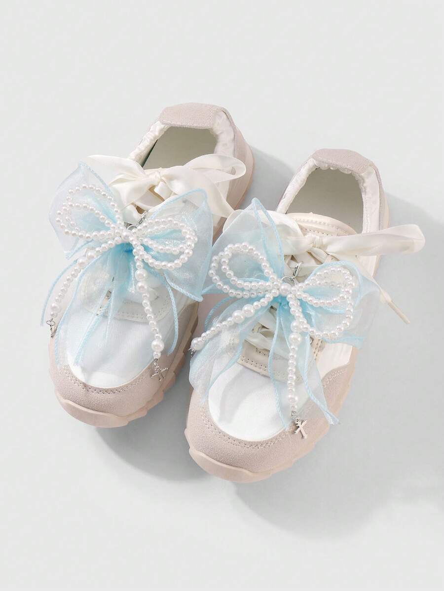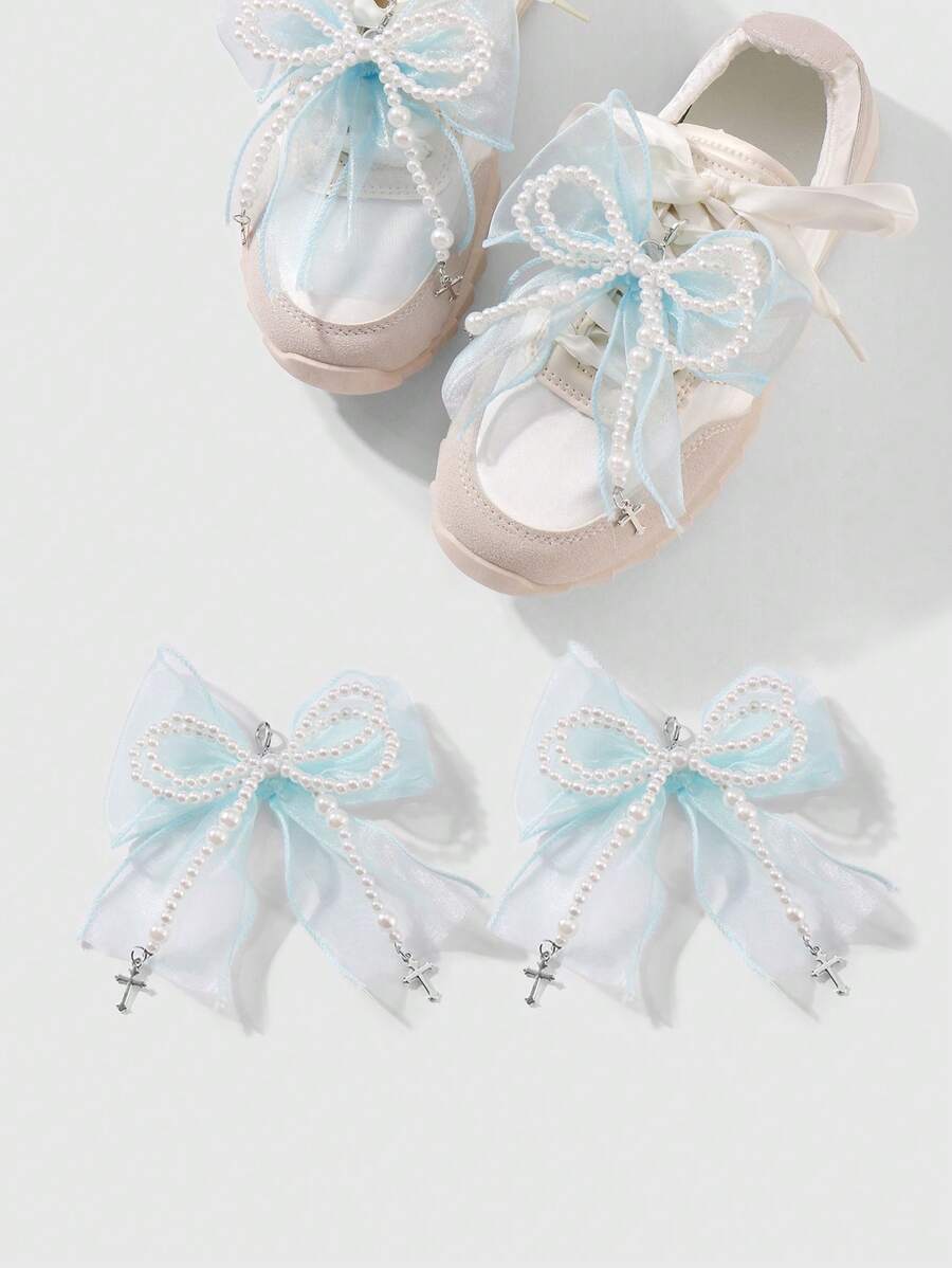 Kawaii مجموعة من 2 قطعة على الطراز الكوري، أنيق، مصنوع يدويًا بخرز أبيض مصنوع من اللؤلؤ الوهمي وشبكة زرقاء بزر مزدوج، قطع تزيين الأحذية شاملة، إكسسوارات متعددة الاستخدامات للنساء، مناسب للاستخدام اليومي، هدية عطلة