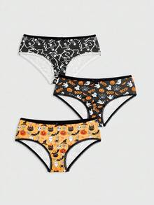 Kawaii 3 قطع من السراويل الداخلية المريحة للنساء مطبوعة بتصاميم اليقطين الداكن، الشبح، الهيكل العظمي، القطة السوداء، الخفاش، وشبكة العنكبوت لمناسبة عيد الهالوين