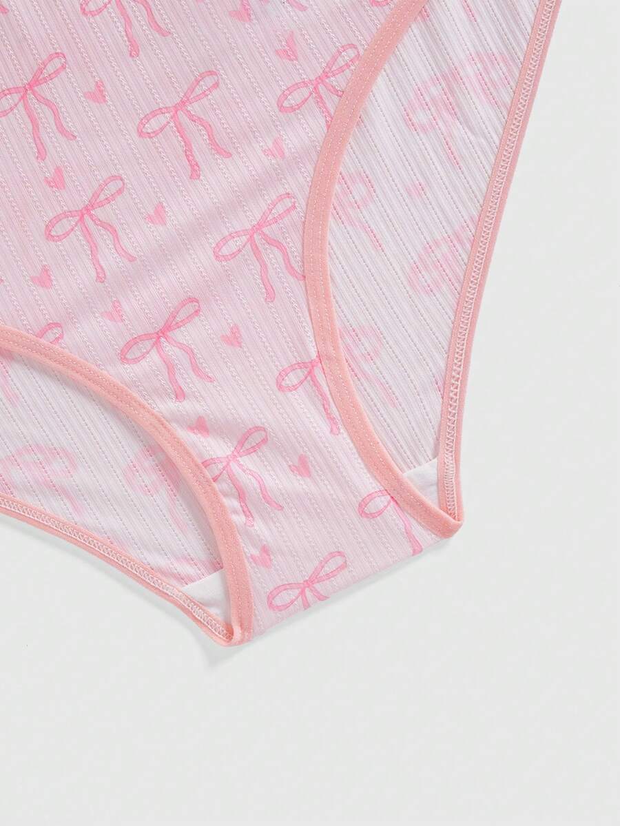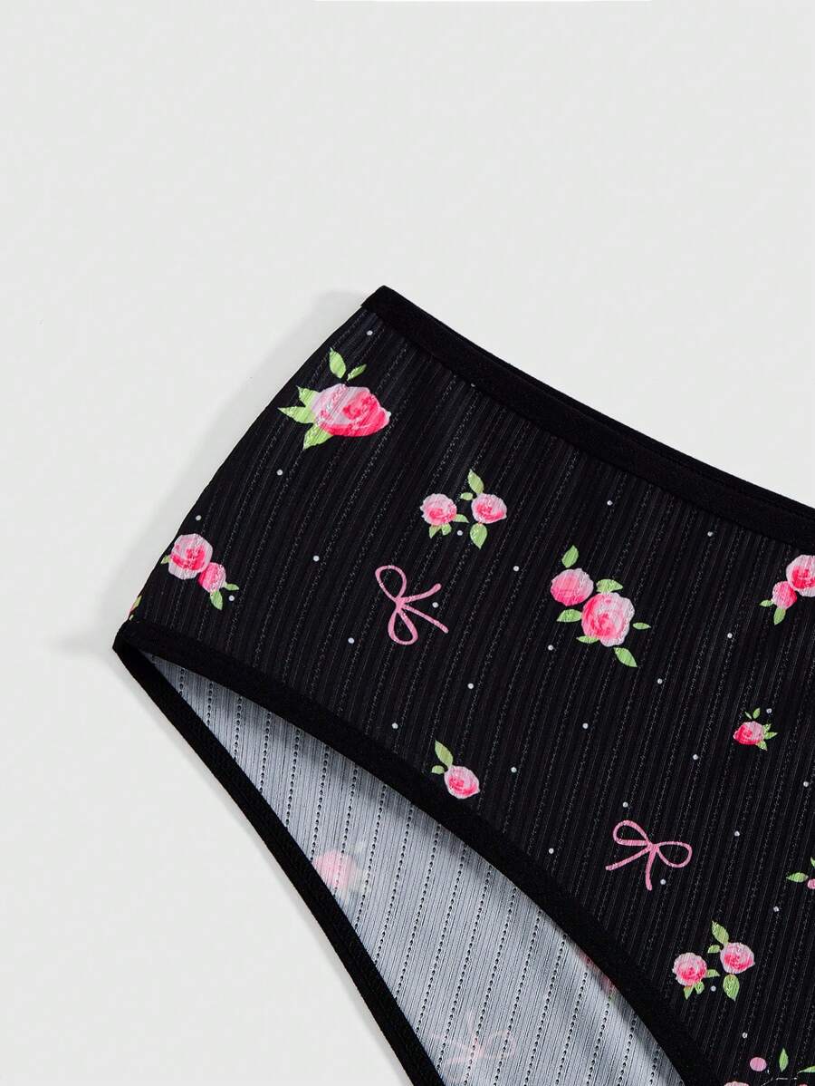 Kawaii طقم ملابس داخلية بطبعة زهرية مع فيونكة رومانسية مقاسات كبيرة قابلة للتنفس 3قطع/عبوة