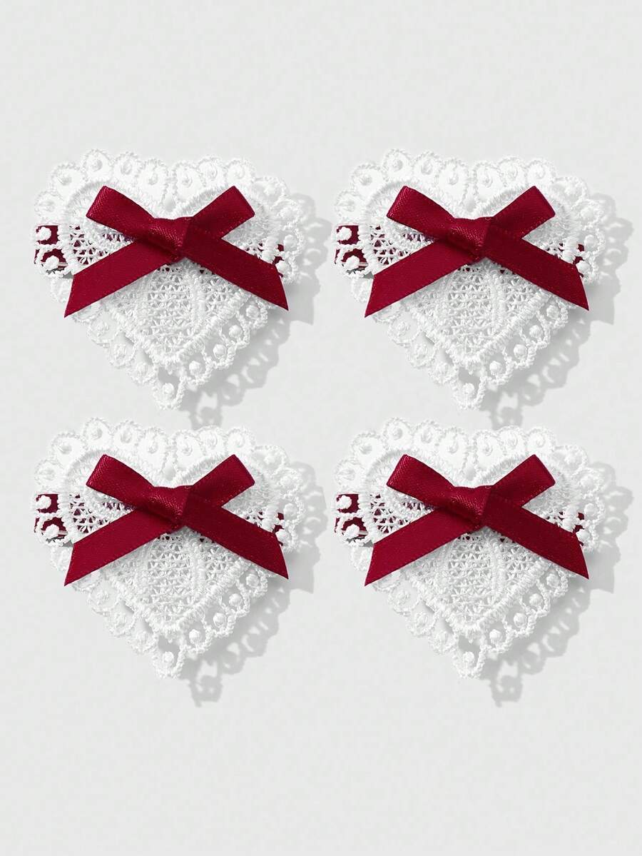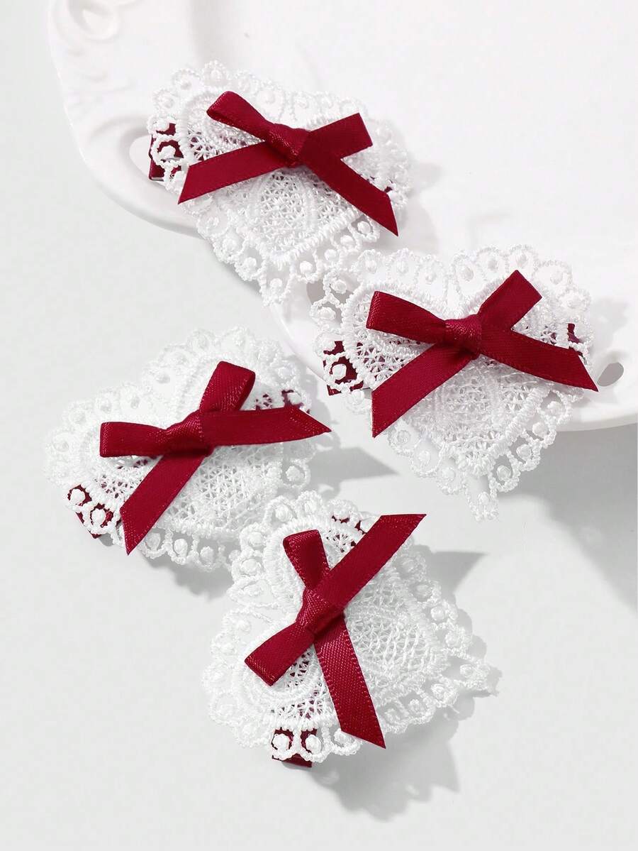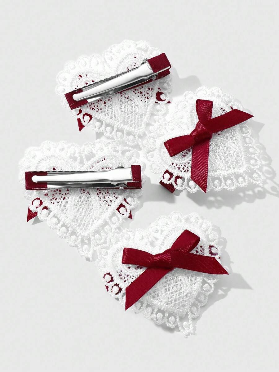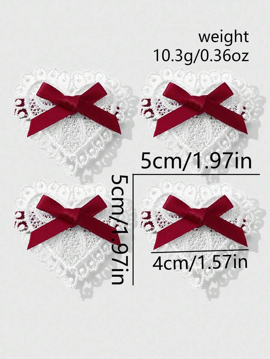 Kawaii 4 قطع شريط أحمر أنيق عتيق عالي الجودة، مشابك شعر قلب أبيض مفرغ مجموعة مشابك الشعر للذيل والغرة، مناسبة للنساء والفتيات للاستخدام اليومي وكهدايا المناسبات