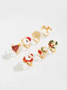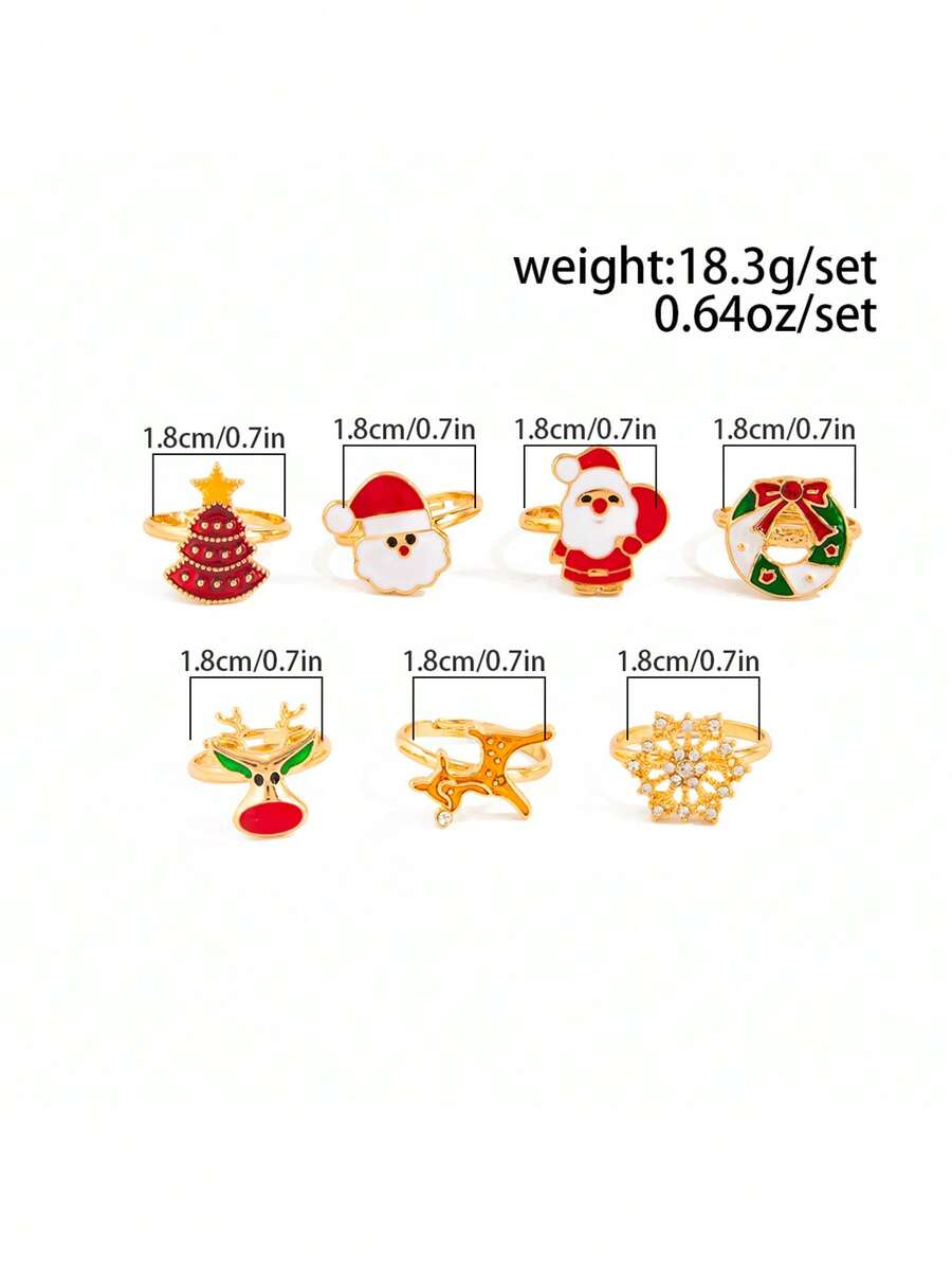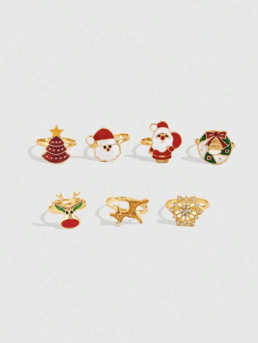 Kawaii 7 قطع مجموعة خواتم قابلة للتعديل بتصميم كرتوني جميل وأنيق للكريسماس، هدية عيد