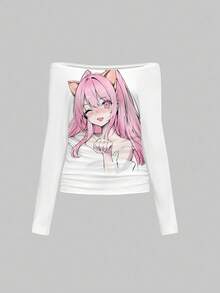 Kawaii قميص تي شيرت أبيض طويل الأكمام مطبوع بطبعة كاواييي أنمي Y2K مثير بكتف منحرف مجعد وفضفاض للنساء