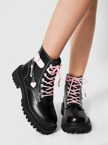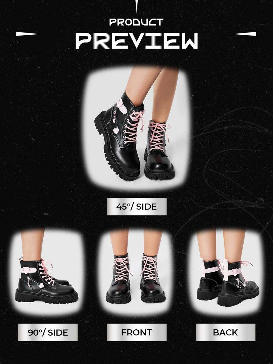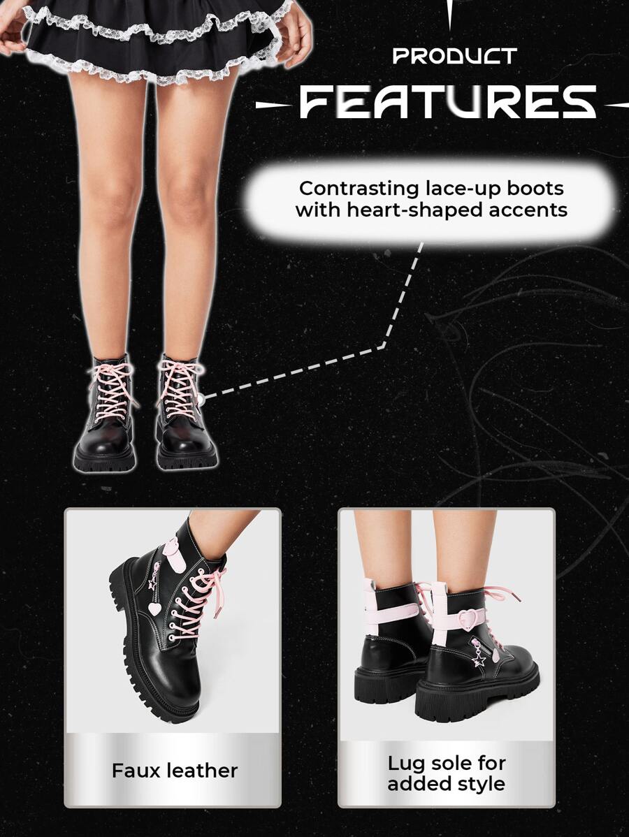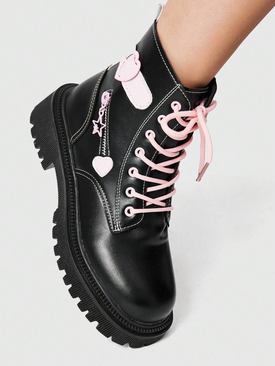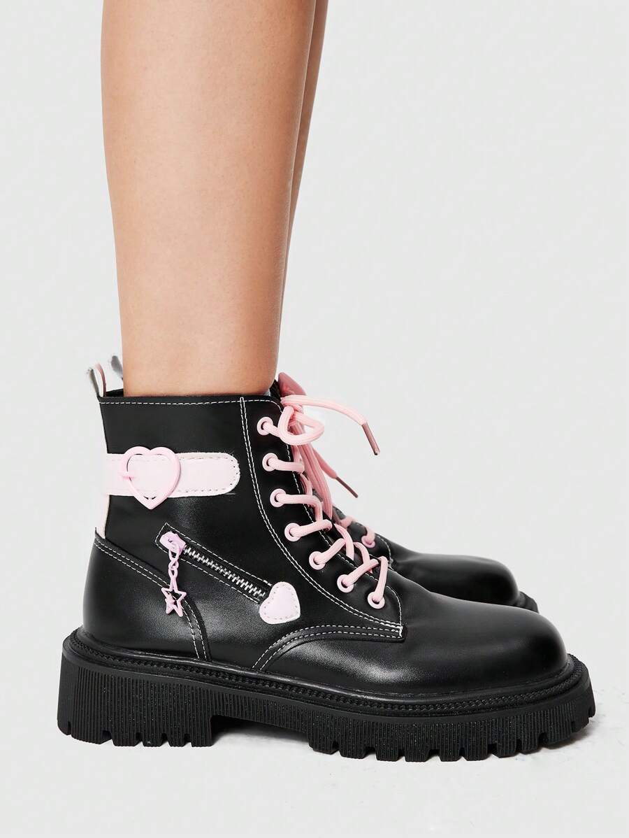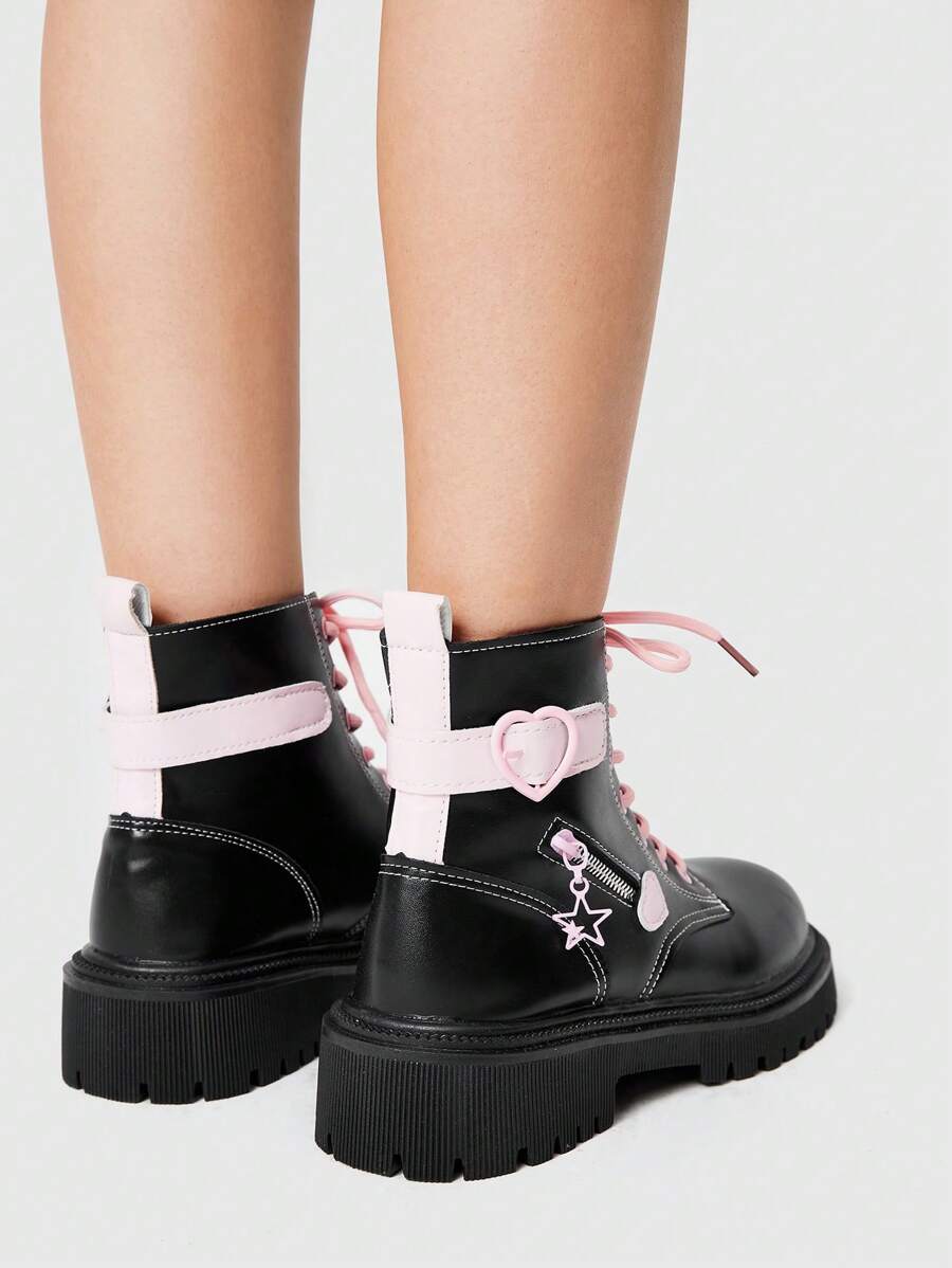 Kawaii بوت كاجوال بكعب منصة 5 سم رأس مستدير بطراز إنجليزي قديم للنساء، بلون أسود وزهري جذاب للاستخدام اليومي، سميكة القاعدة تزيد من رشاقة الشكل، مزينة بحلية قلب ومشبك سحاب على شكل نجمة، مناسبة لمناسبة عيد الحب