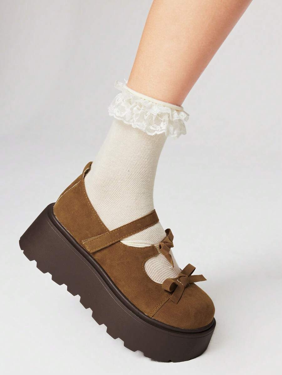 Kawaii حذاء ماري جين من الجلد المدبوغ بنمط عفوي ، كعب منصة ٧سم بلون بني القهوة ،شكل دائري مفتوح للأصابع، وعقدة مزخرفة ، طراز شامل وكاجوال مناسب للنساء لأجل الهندسات الريفية