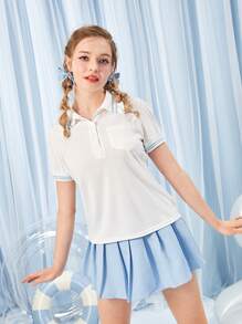 Kawaii تي شيرت شريط متباين جيب مرقع بعنق بولو