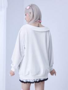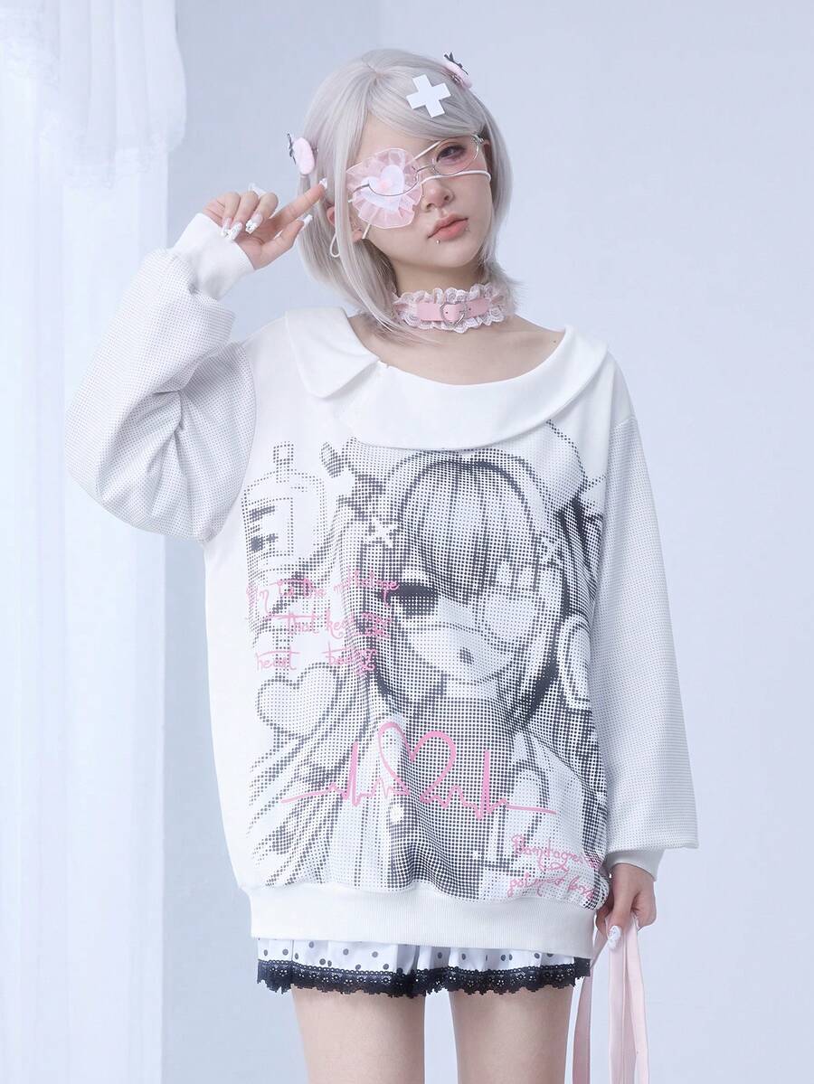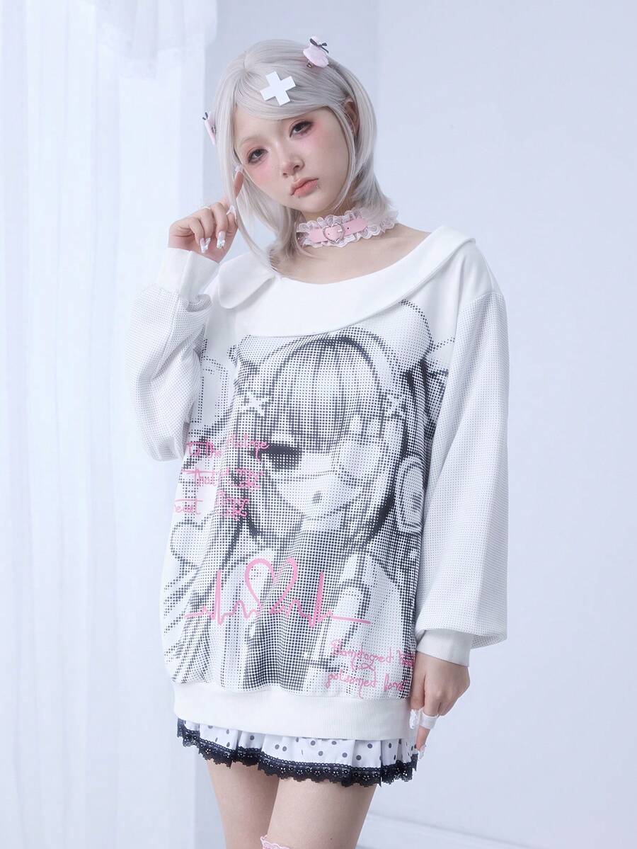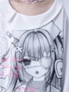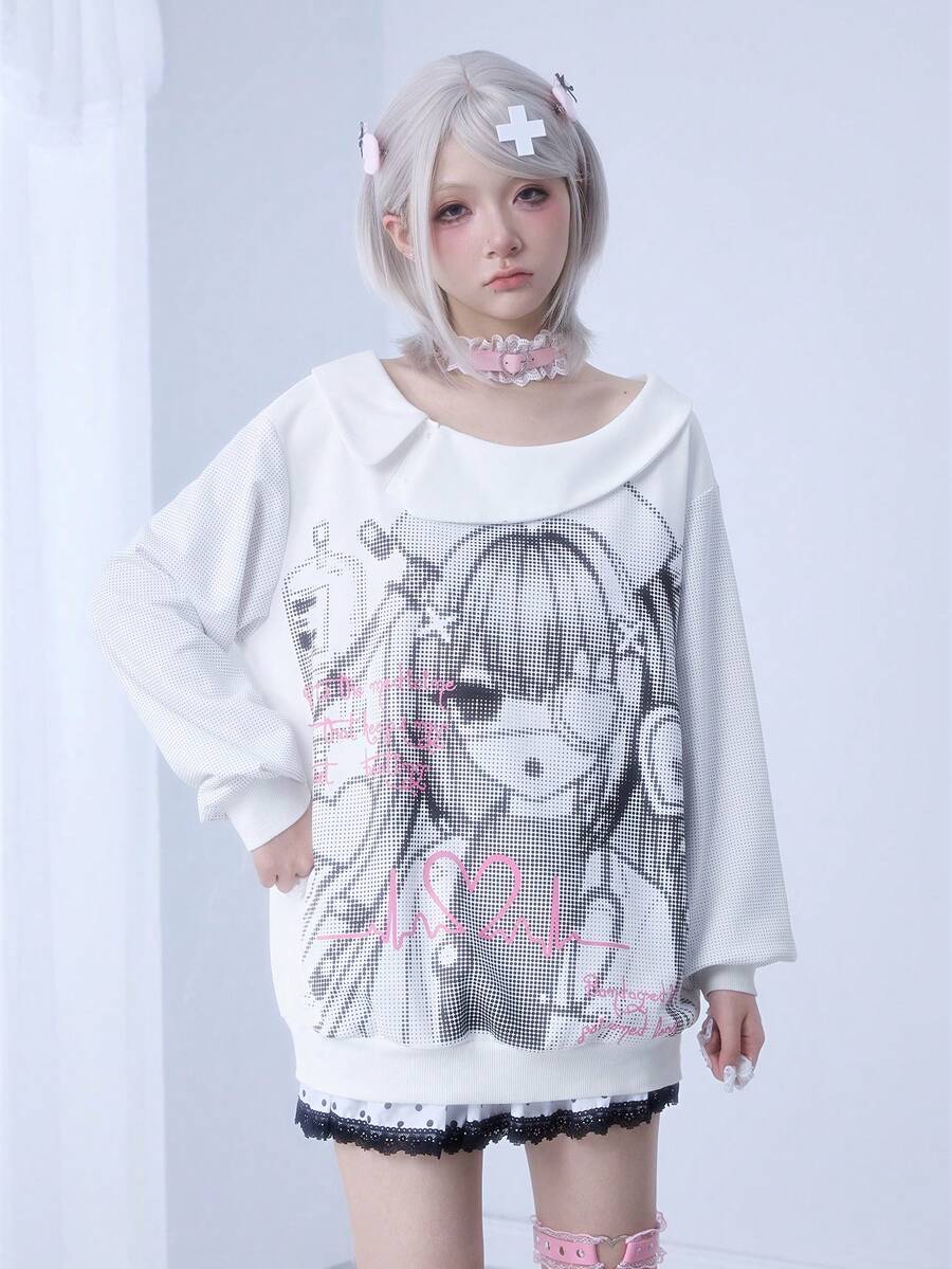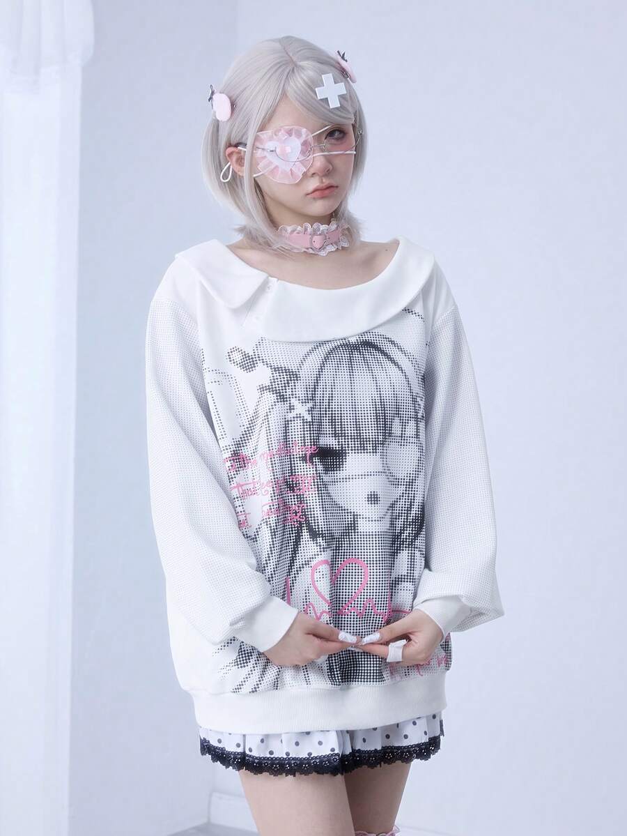 Kawaii سويت شيرت نسائي بياقة بيتر بان وكتف مائل ورسومات كرتونية لطيفة كاواي