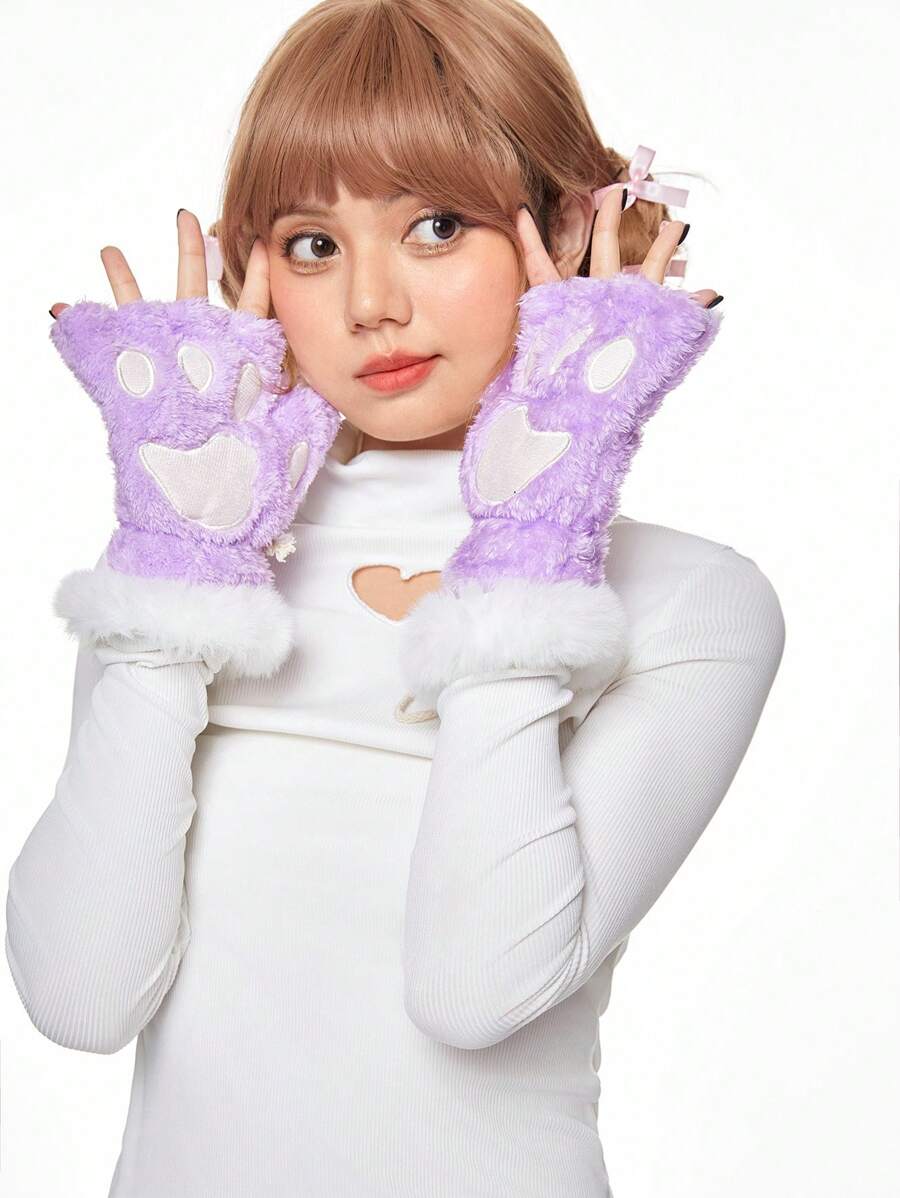 Kawaii قفازات بلا أصابع كرتونية جميلة بأشكال أرجل القطط ، قفازات دافئة ونصف أصابع من الفرو للرياضة والارتداء اليومي في الخريف والشتاء