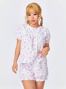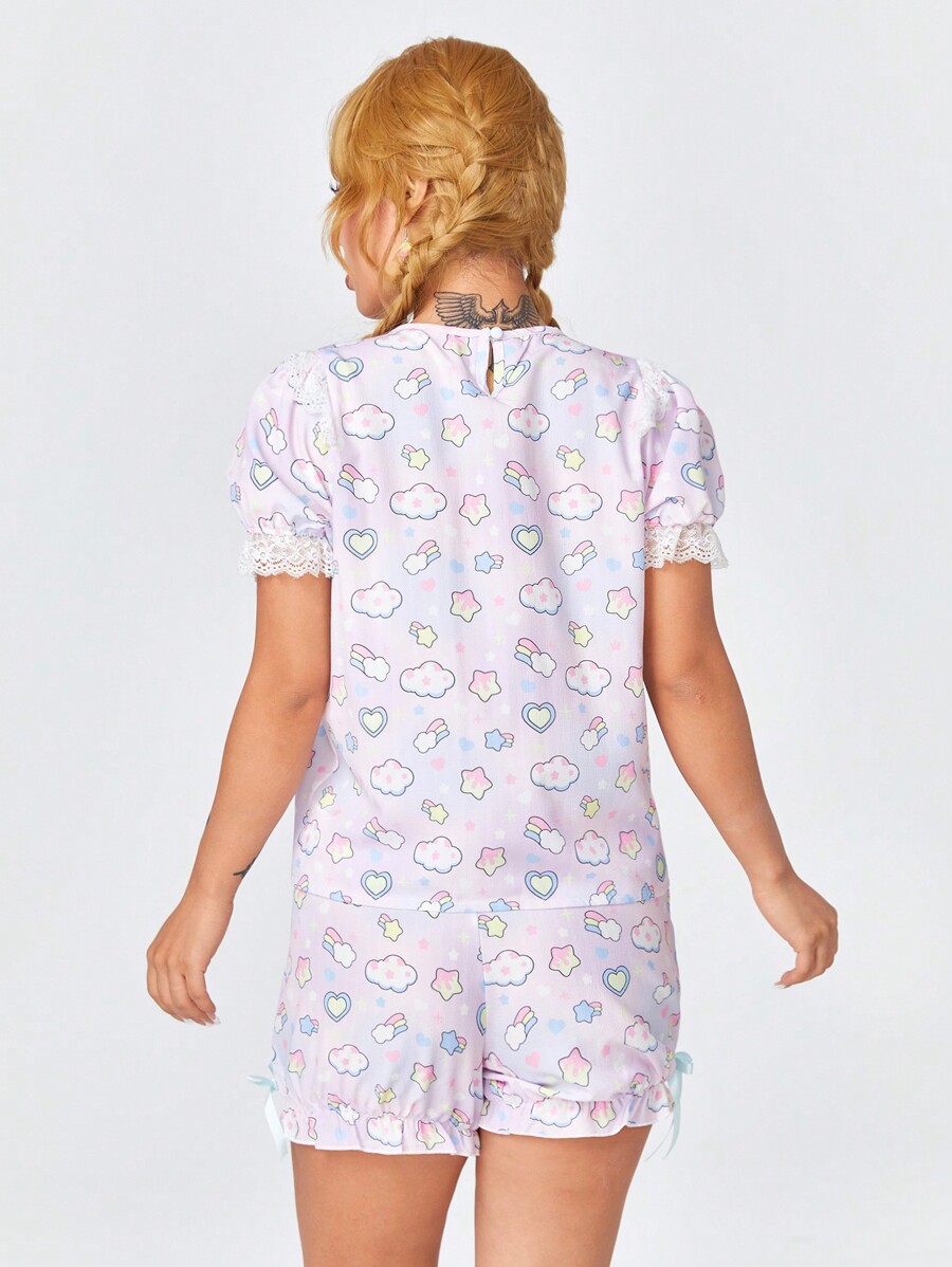 Kawaii مجموعة ملابس منزلية بأكمام قصيرة وسروال قصير منتفخ بالدانتيل مطبوع عليه رسوم كارتونية لطيفة