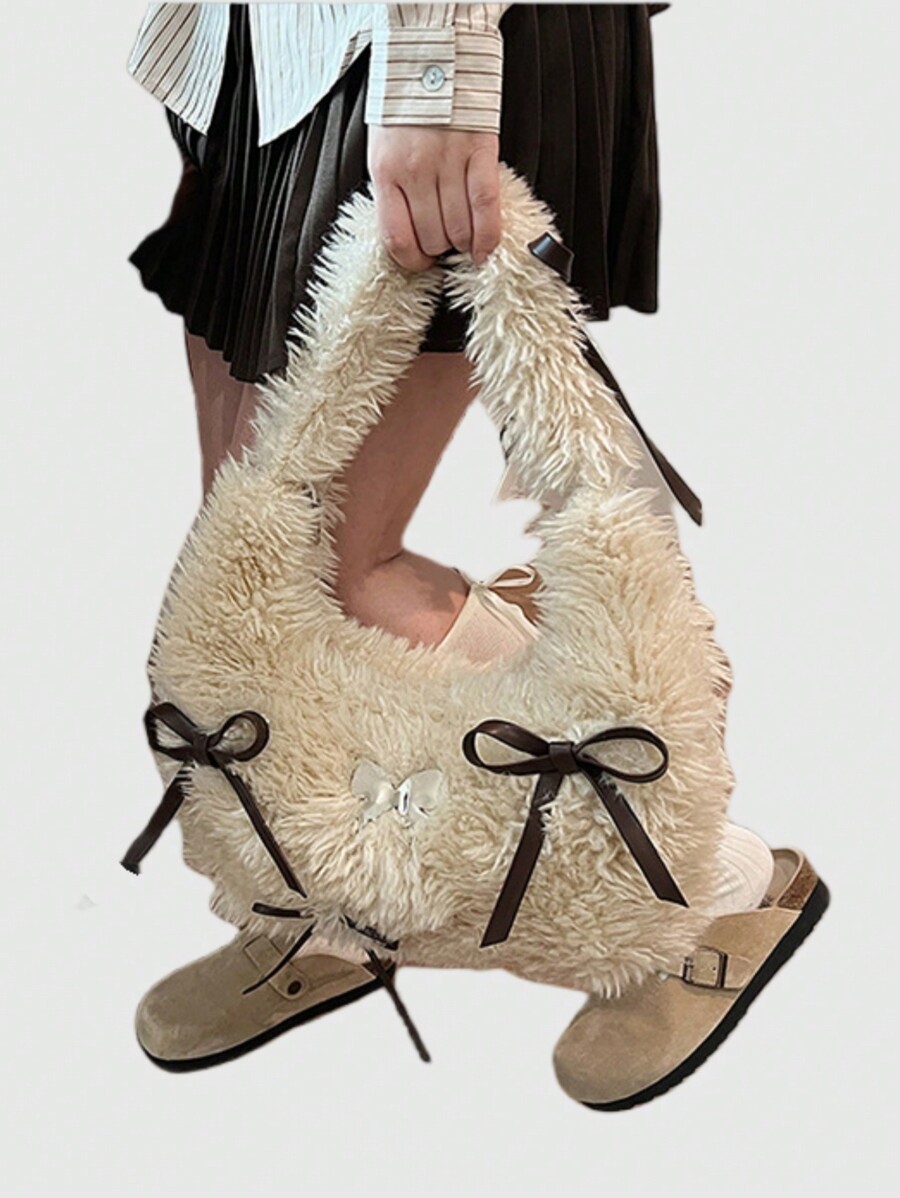 Kawaii حقيبة كتف مخملية ذات فيونكة جميلة وحلوة، حقيبة كاجوال ريترو للخريف/الشتاء
