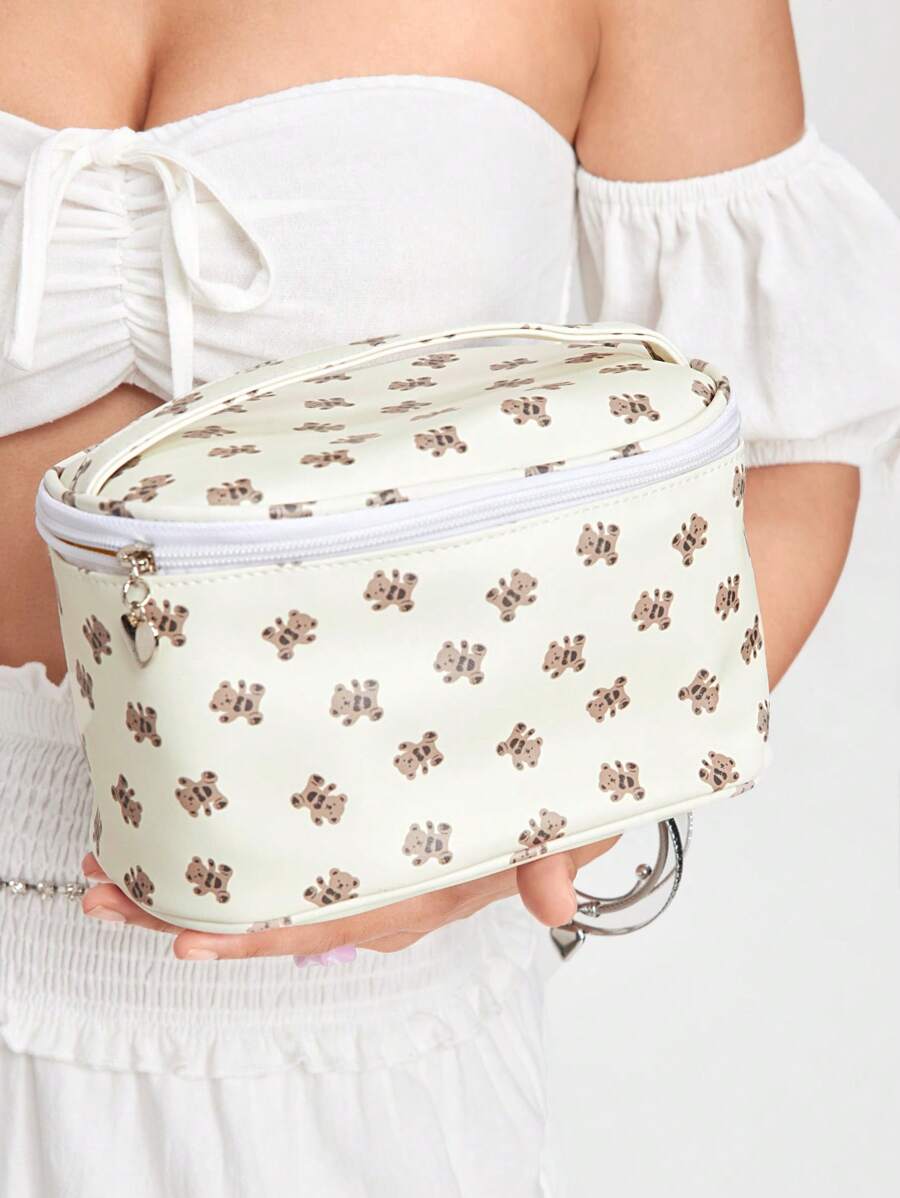 Kawaii حقيبة تجميل محمولة ذات سعة كبيرة بغطاء قابل للطي يحمل نمط الدب الرائج والجميل