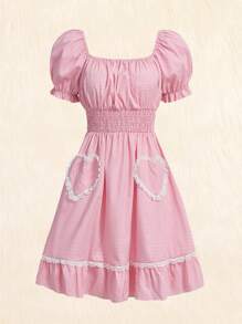 Kawaii فستان بنمط الحليب الجامي المخطط يتميز بأكمام فوف وحاشية مكشكشة