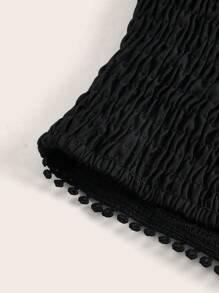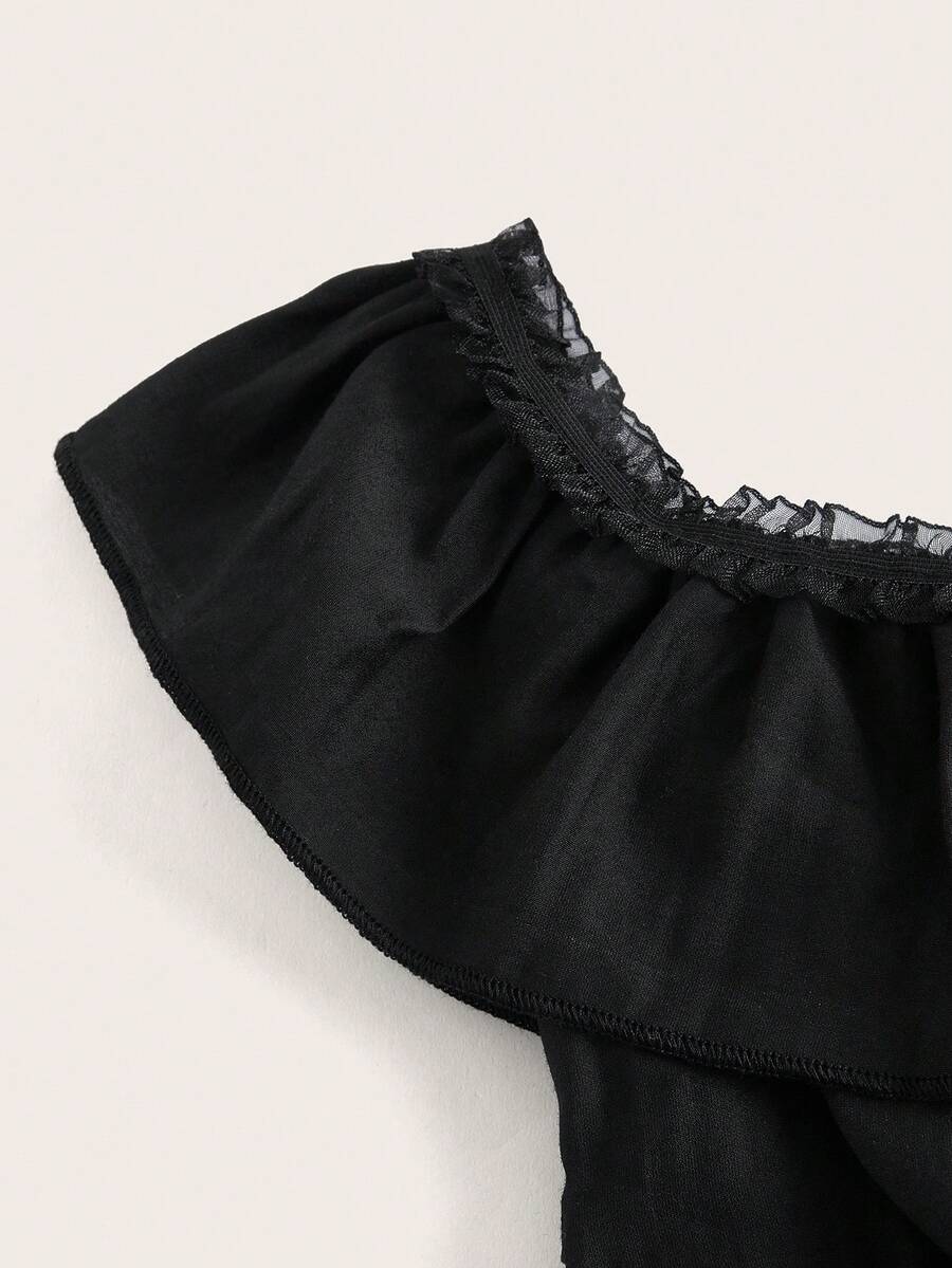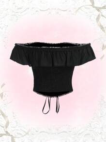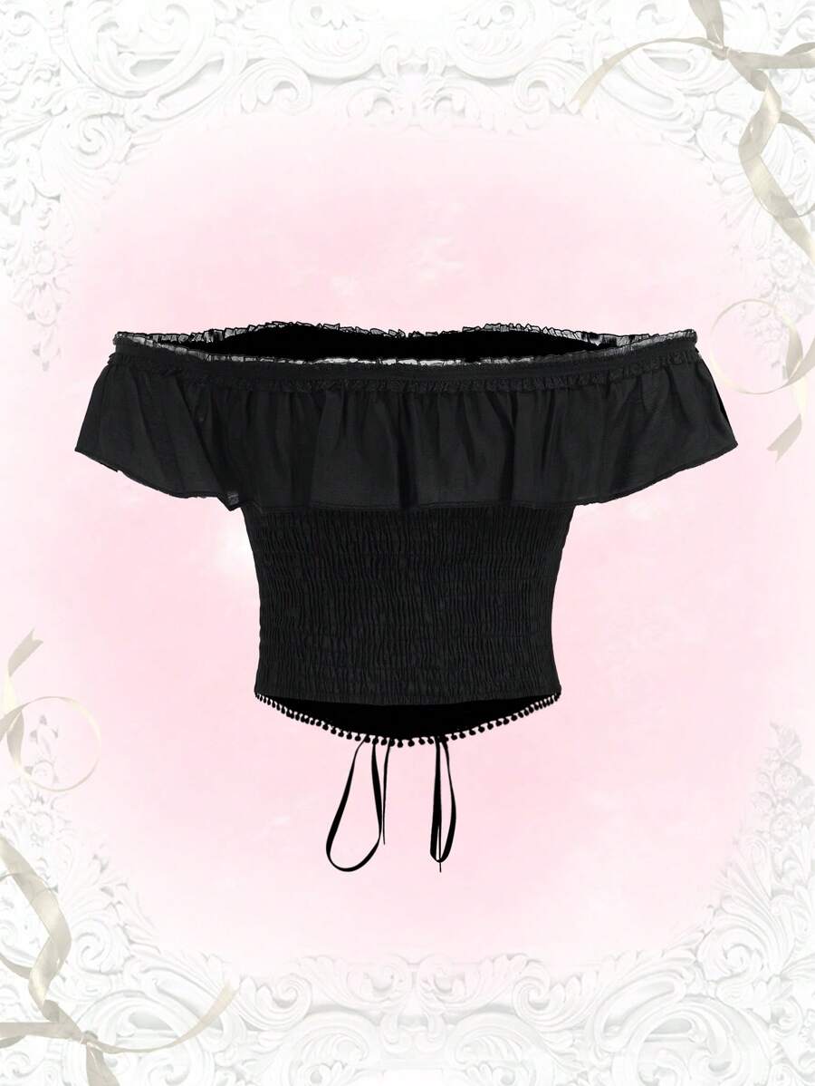 Kawaii بلوزة رباط امامي مقلم بكشكش مكشوف الكتف بغرز