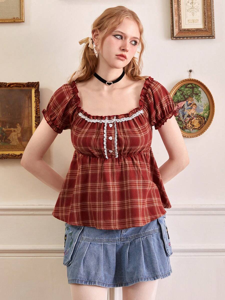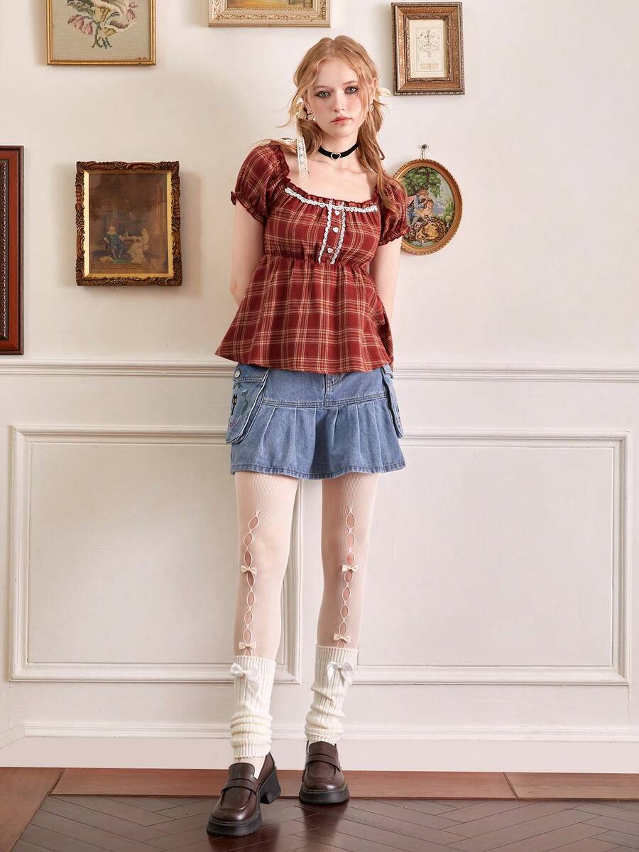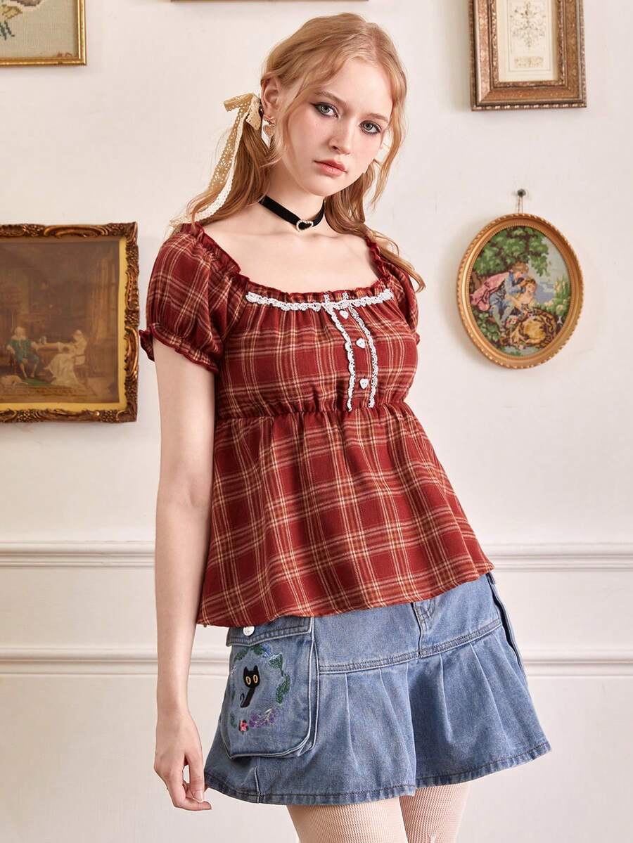 Kawaii بلوزة مطوي الثنايا طباعة مربع النقش مقلم دانتيل