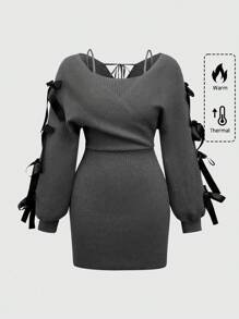 Kawaii فستان كنزة صوفية سحاب مناسب للمقاسات الكبيرة مزخرف بشريط خصر ربطة عنق رومانسي وناعم