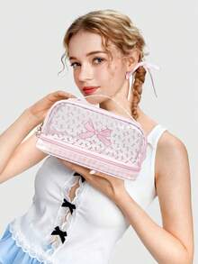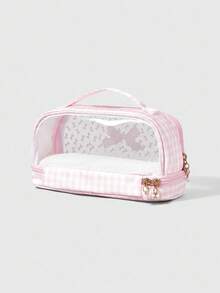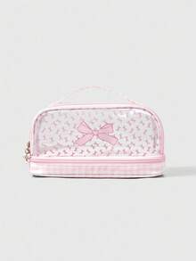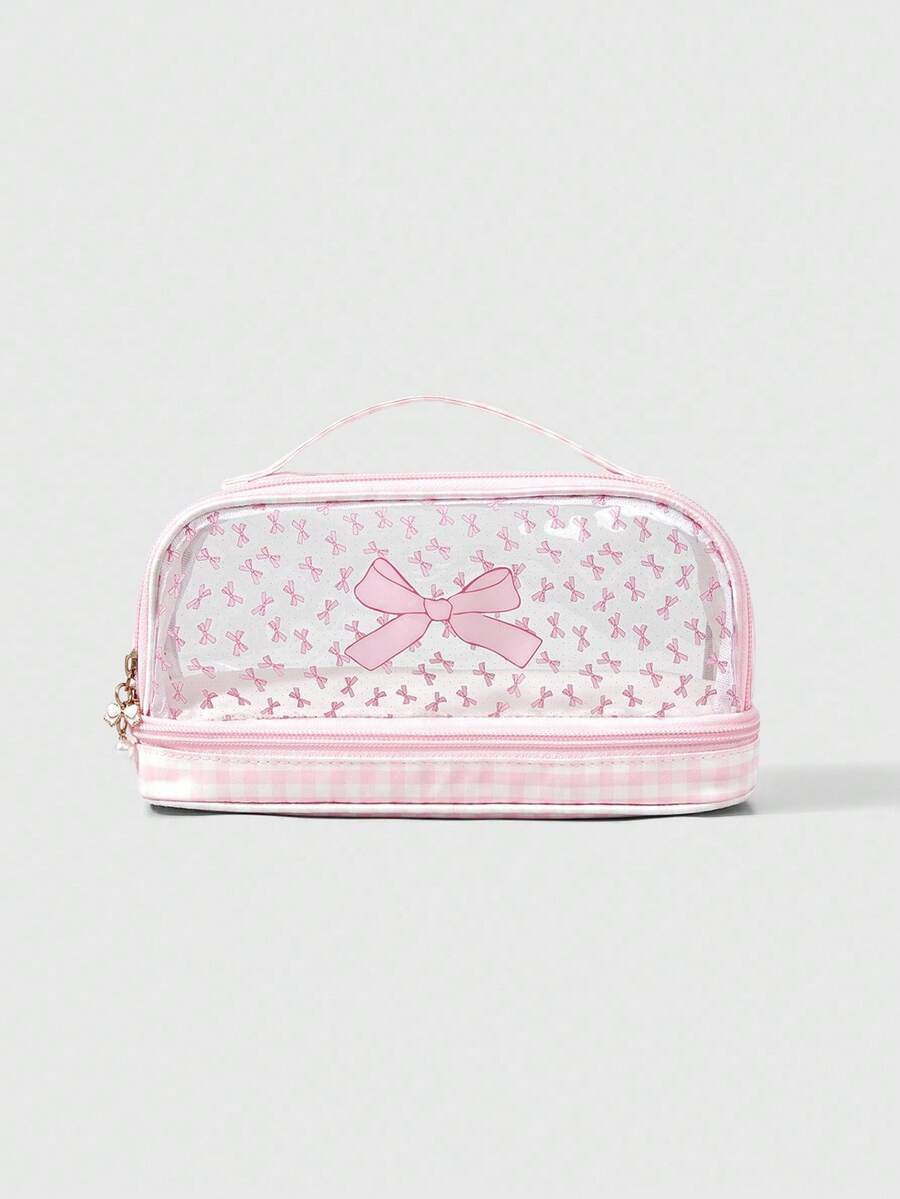 Kawaii حقيبة مستحضرات تجميل شفافة ذات طبقتين مع فيونكة وردية كبيرة السعة محمولة