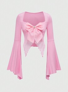 Kawaii تي شيرت قصير وردي فاتح مع ياقة وربطة عنق مناسبة ليوم الحب، أكمام متفجرة ضيقة مناسبة للشكل
