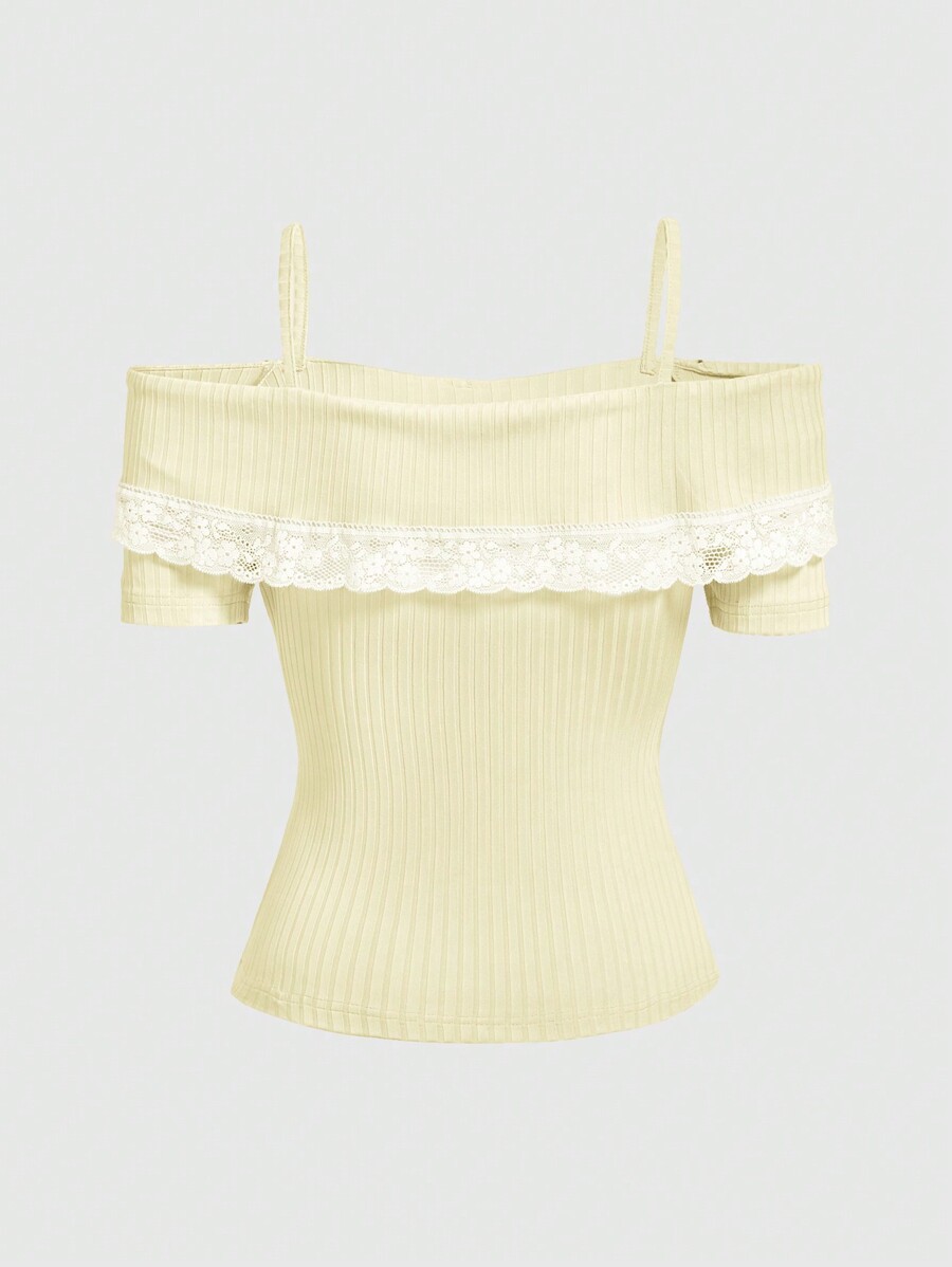 Kawaii تيشرت أنيق بأكمام قصيرة مع فتحة للكتف وتطريز دانتيل بالتباين للنساء