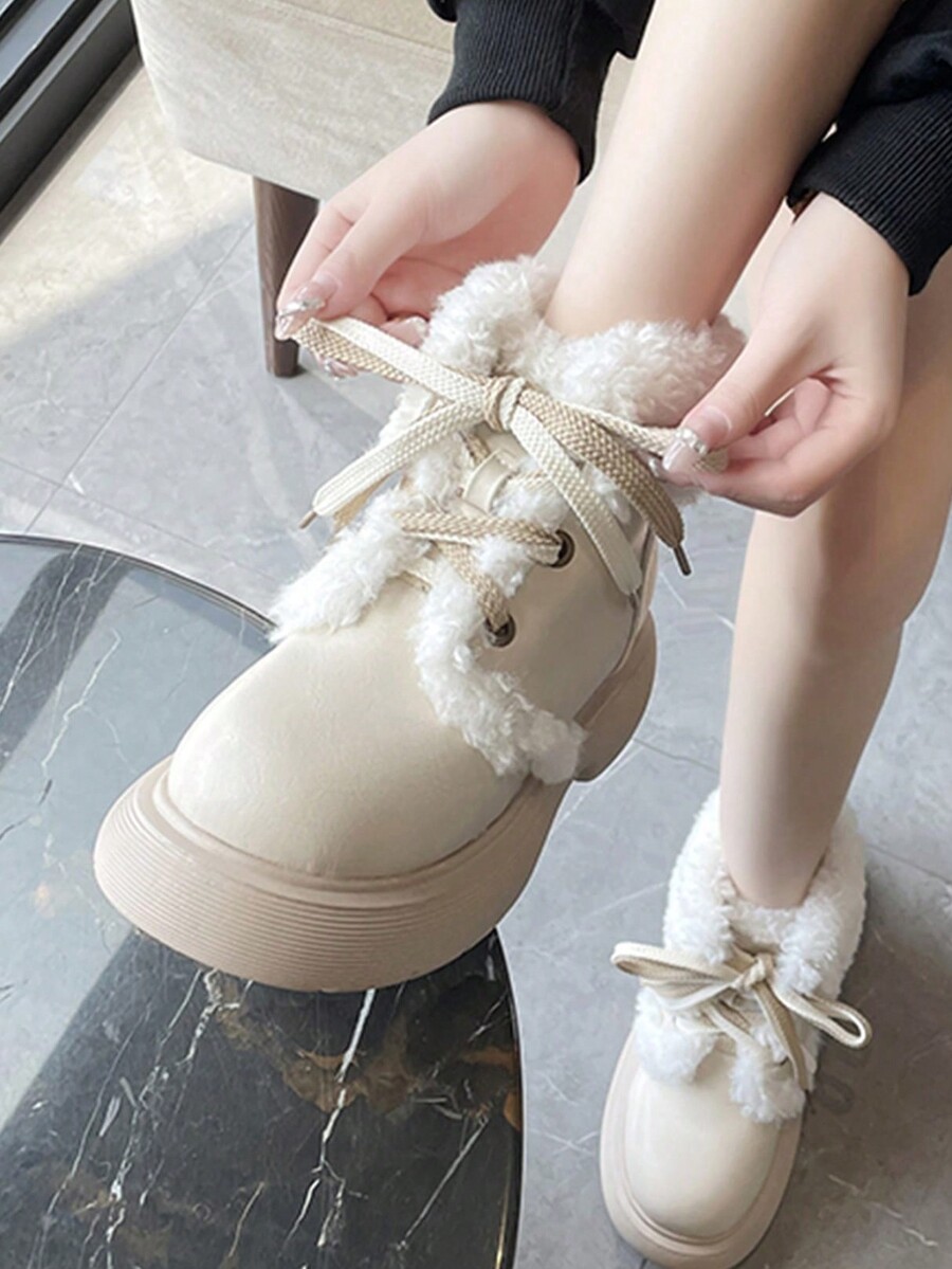 Kawaii حذاء ثلج نسائي مبطن بالحرارة مع رباط أمامي وجوانب دانتيل، حذاء خارجي عصري بارد