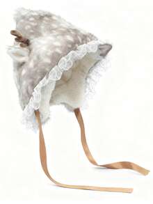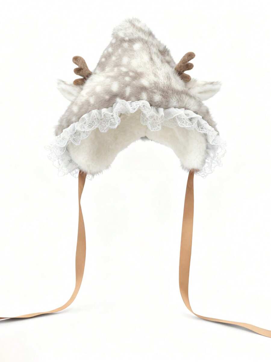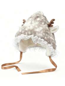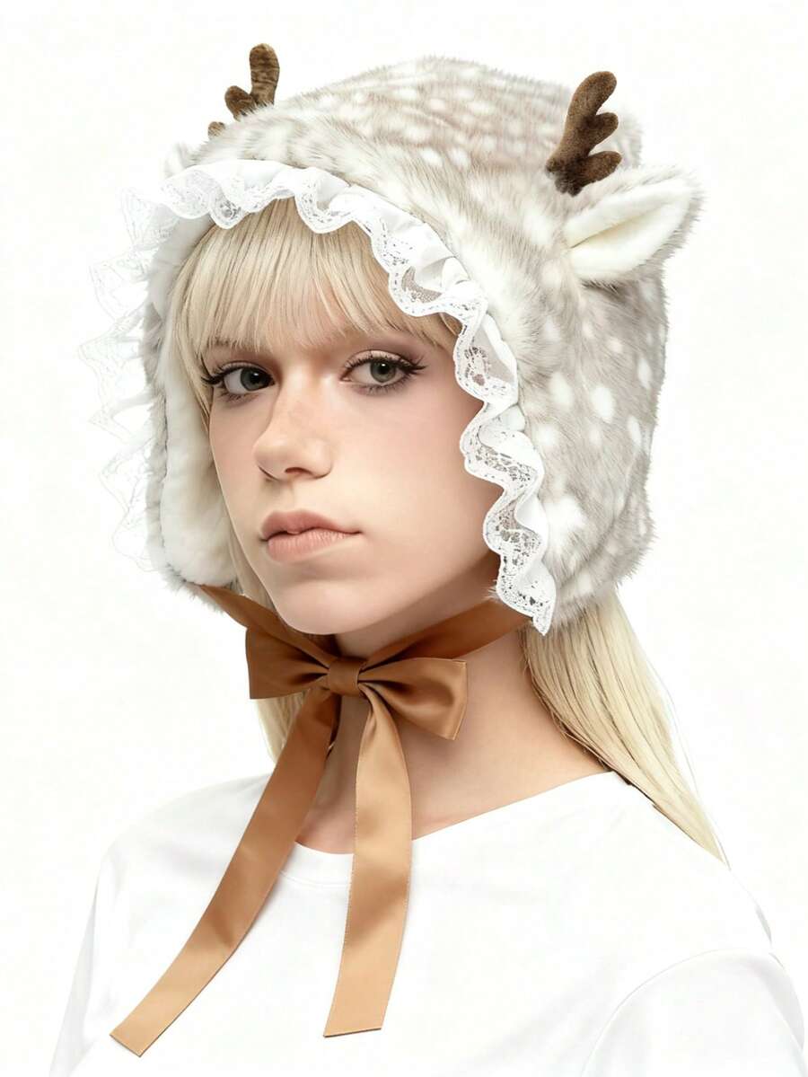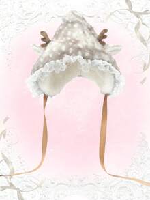 Kawaii قبعة شتوية للنساء قطعة واحدة بطراز فتاة موري بقرون غزال مزيفة وشريط دانتيل، قبعة جميلة بتطريز دانتيل، قبعة دافئة وسميكة لحماية الأذن في الشتاء