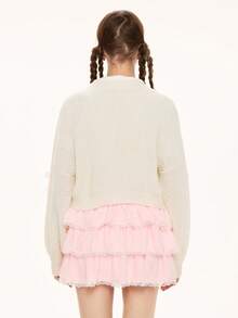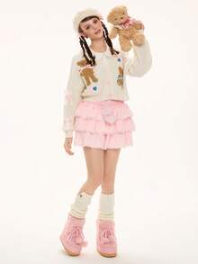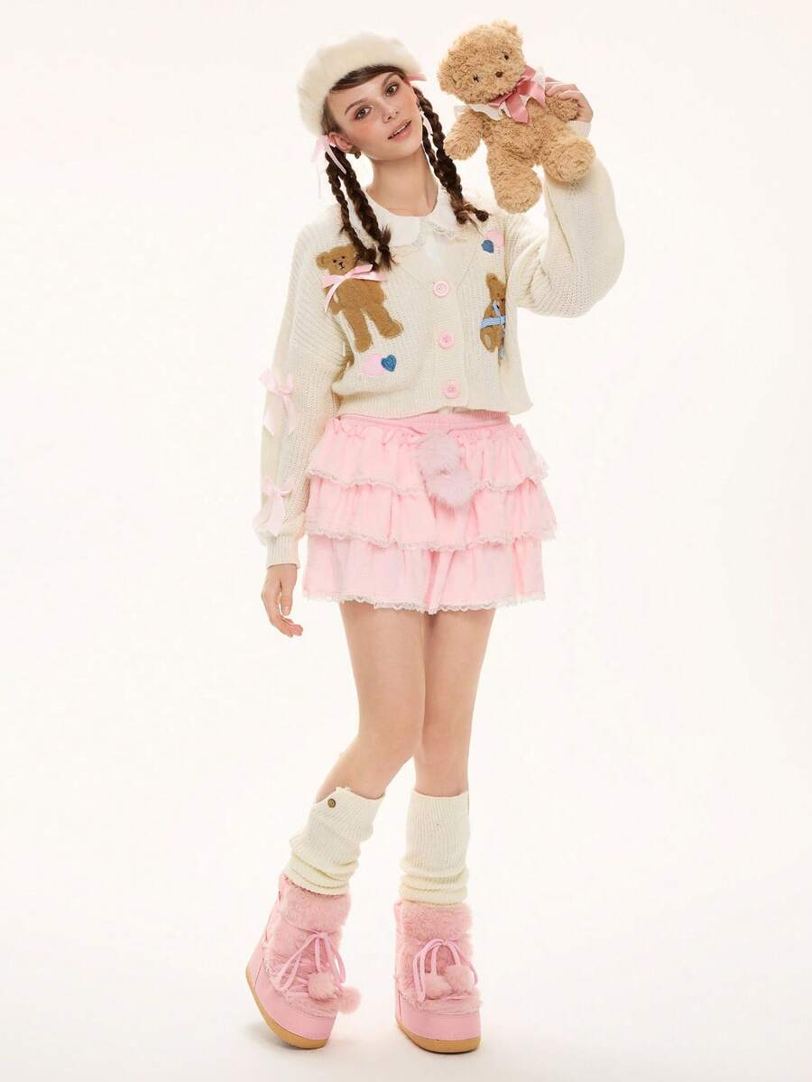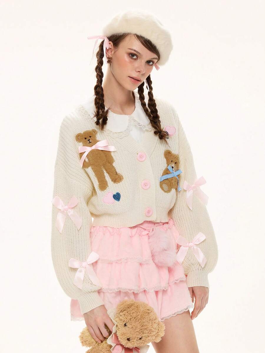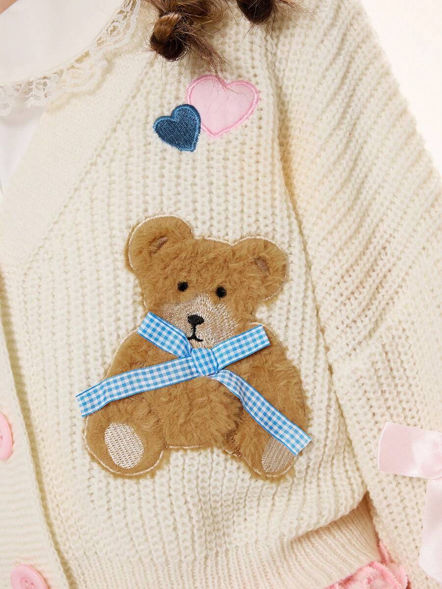 Kawaii كارديجان كنزة صوفية نسائية كاجوال بياقة على شكل حرف V مطرز بدب جميل وقلب وفيونكة، بأكمام طويلة منسدلة