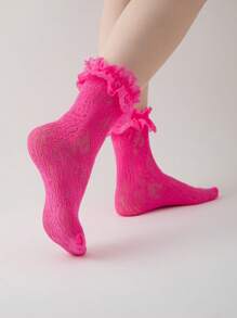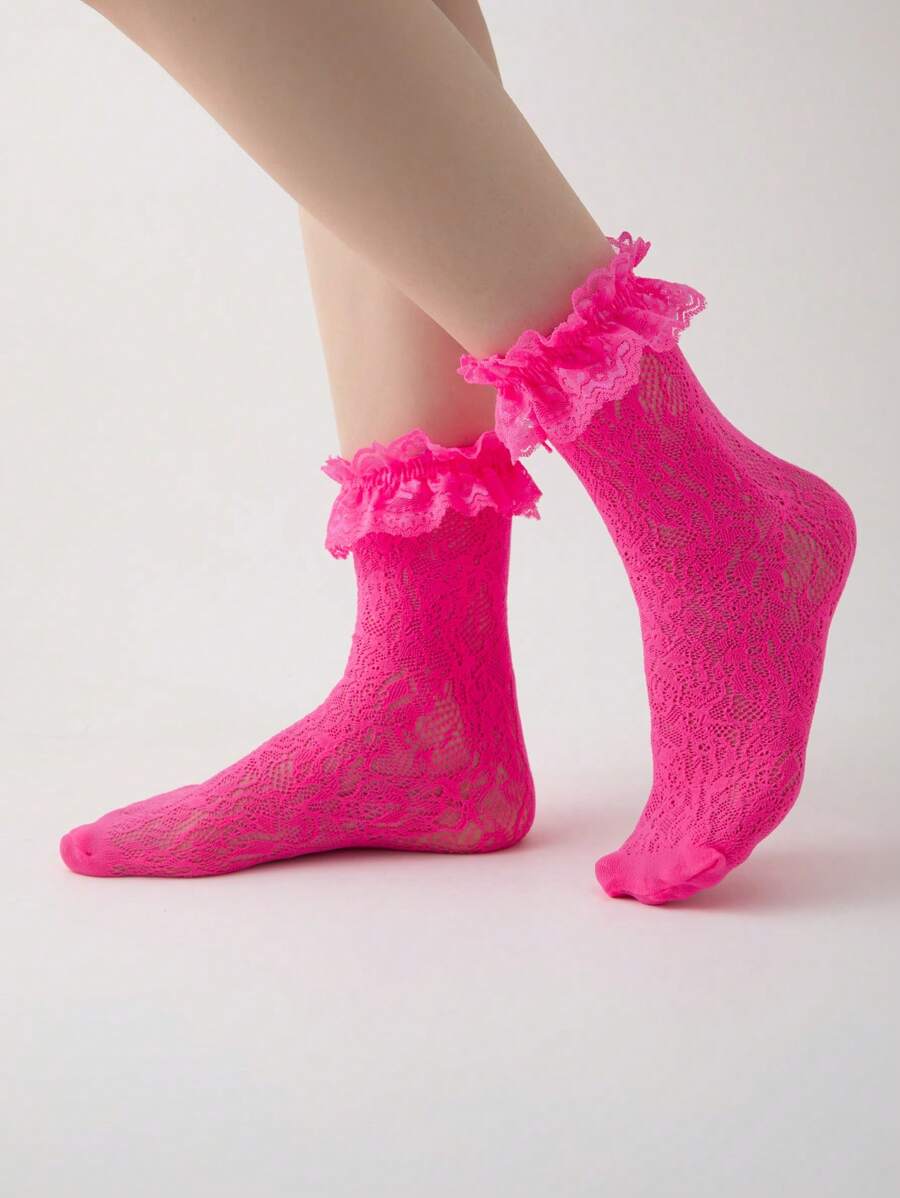 Kawaii جوارب متوسطة الطول للنساء، بتفاصيل مطرزة بالدانتيل والكشكشة، عصرية