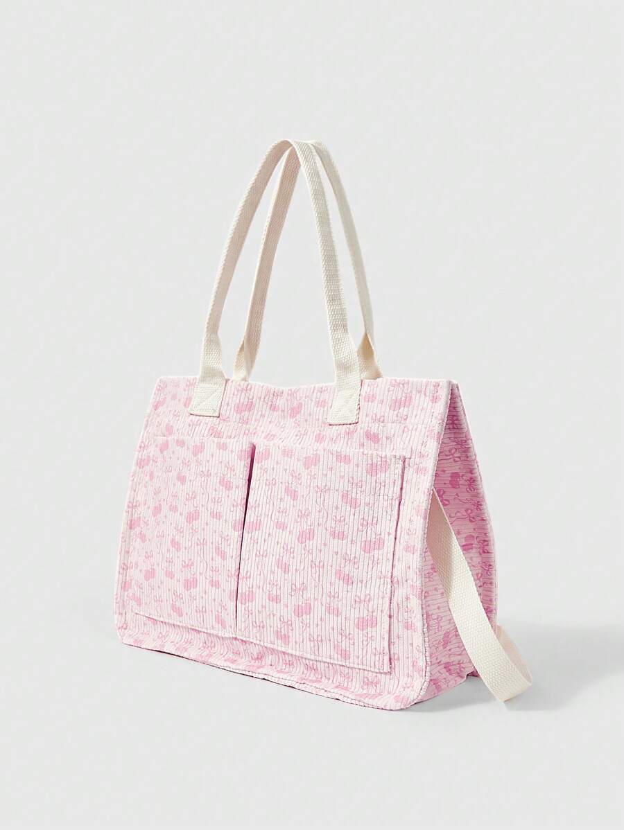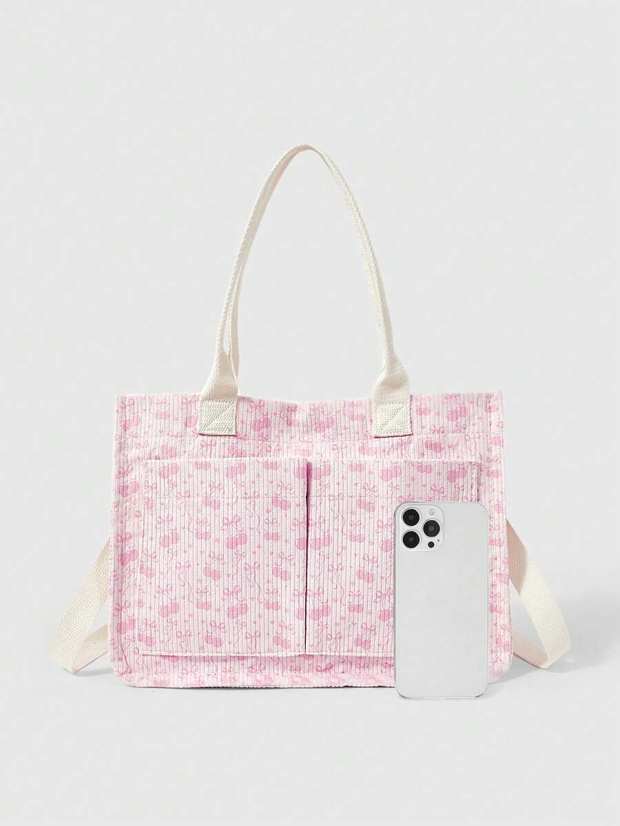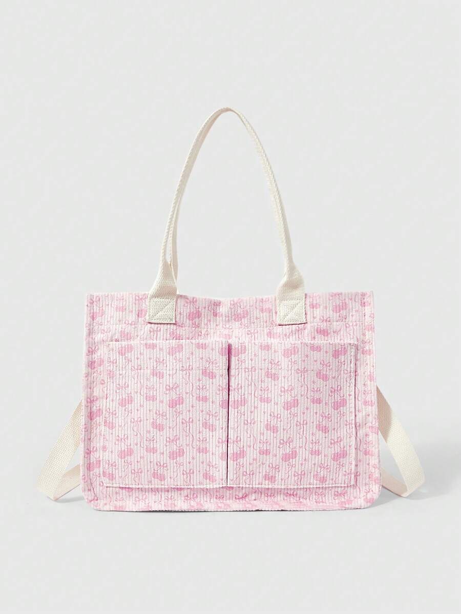 Kawaii حقيبة كورديروي بيضاء فضفاضة للنساء - حقيبة يد قابلة للتحويل بطبعة الفيونكة والكرز للاستخدام عبر الجسم/الكتف