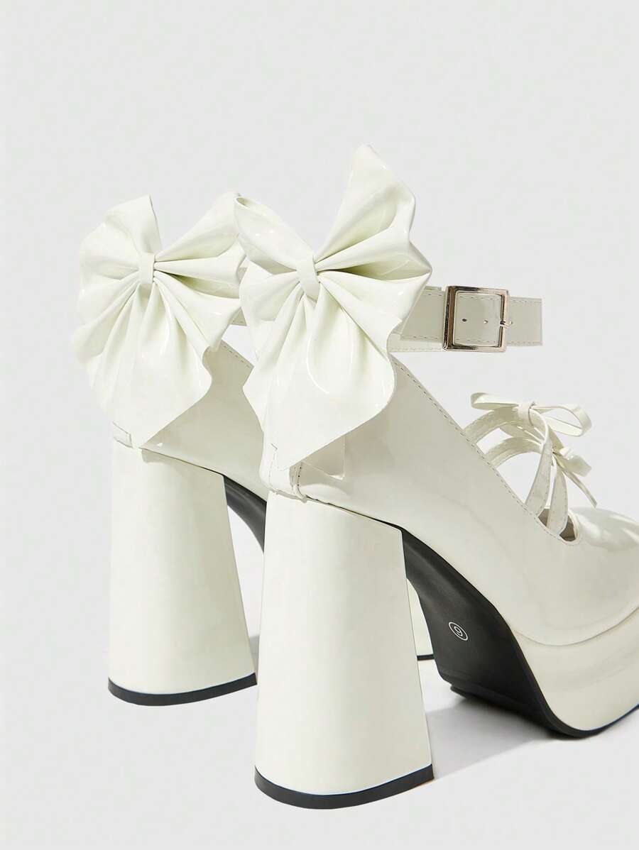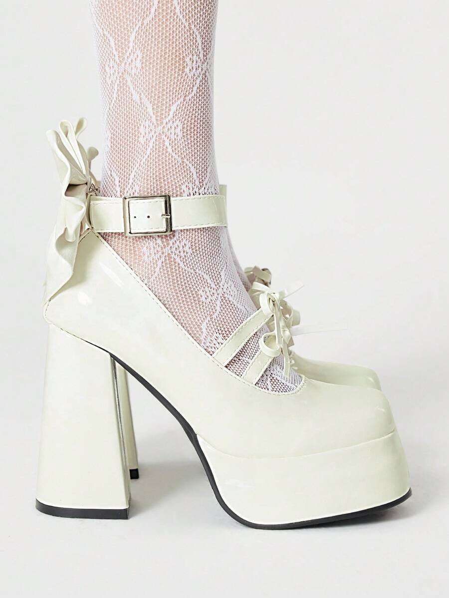 Kawaii أحذية نسائية بكعب عالي مغلقة الأصبع بكعب سميك من الجلد الأبيض، مع رباط، وفيونكة، وأربطة، وكعب منصة، من طراز يونيفورم المدرسة اليابانية