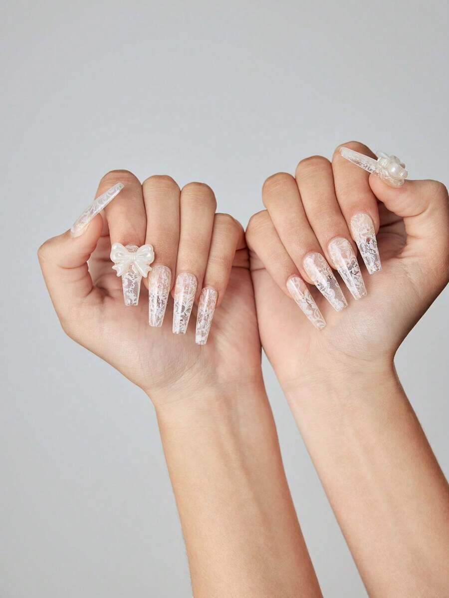 Kawaii أظافر كاذبة شكل نعش مبطنة بالدانتيل الرومانسي الفرنسي الجميل للطراز Y2K المصنوعة يدوياً