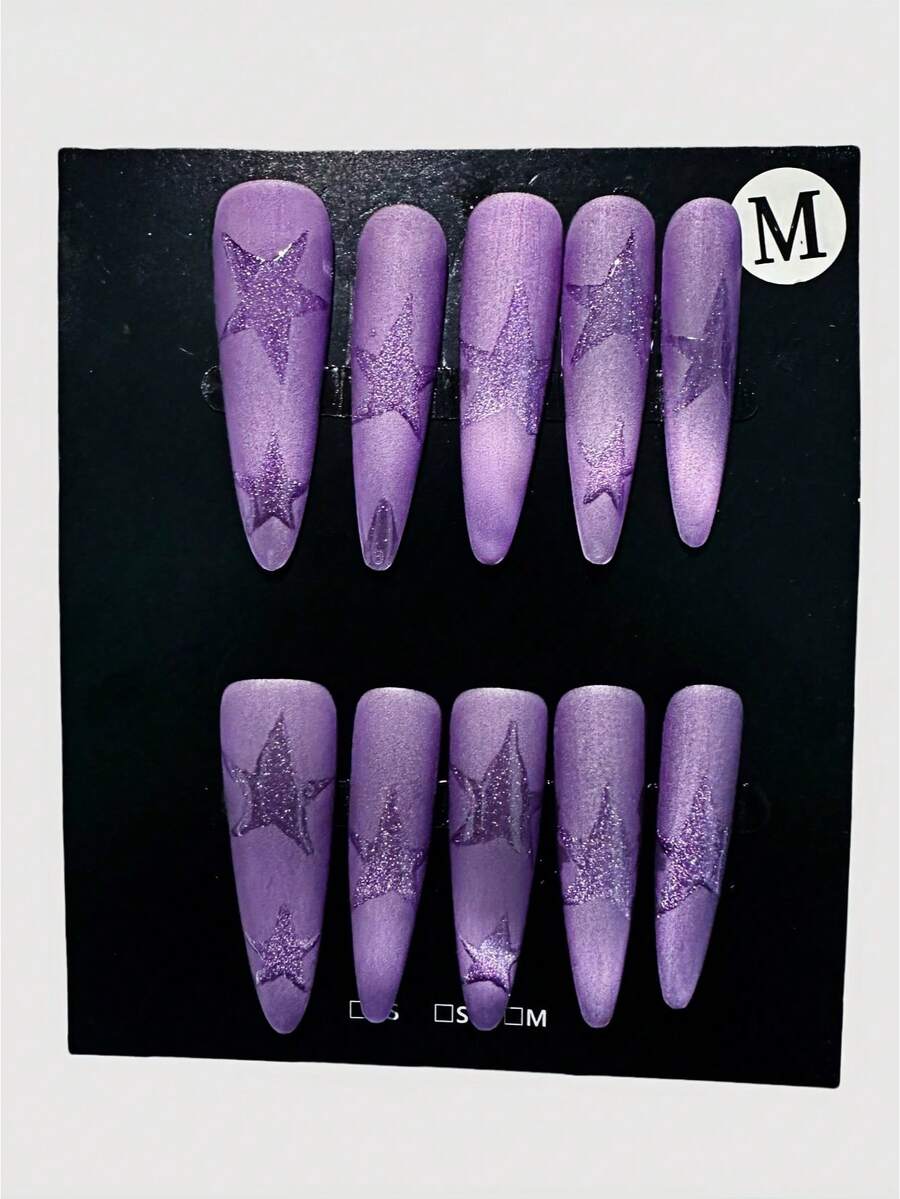 Kawaii أظافر اللصق اليدوية ذات الطابع الفوقي الأرجواني بتصميمات عين القط والنجوم بإحساس مستقبلي، مناسبة لمهرجانات الموسيقى والارتداء اليومي العادي