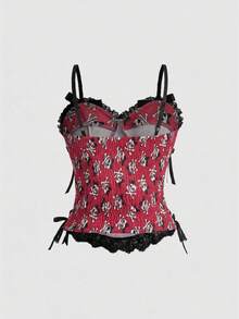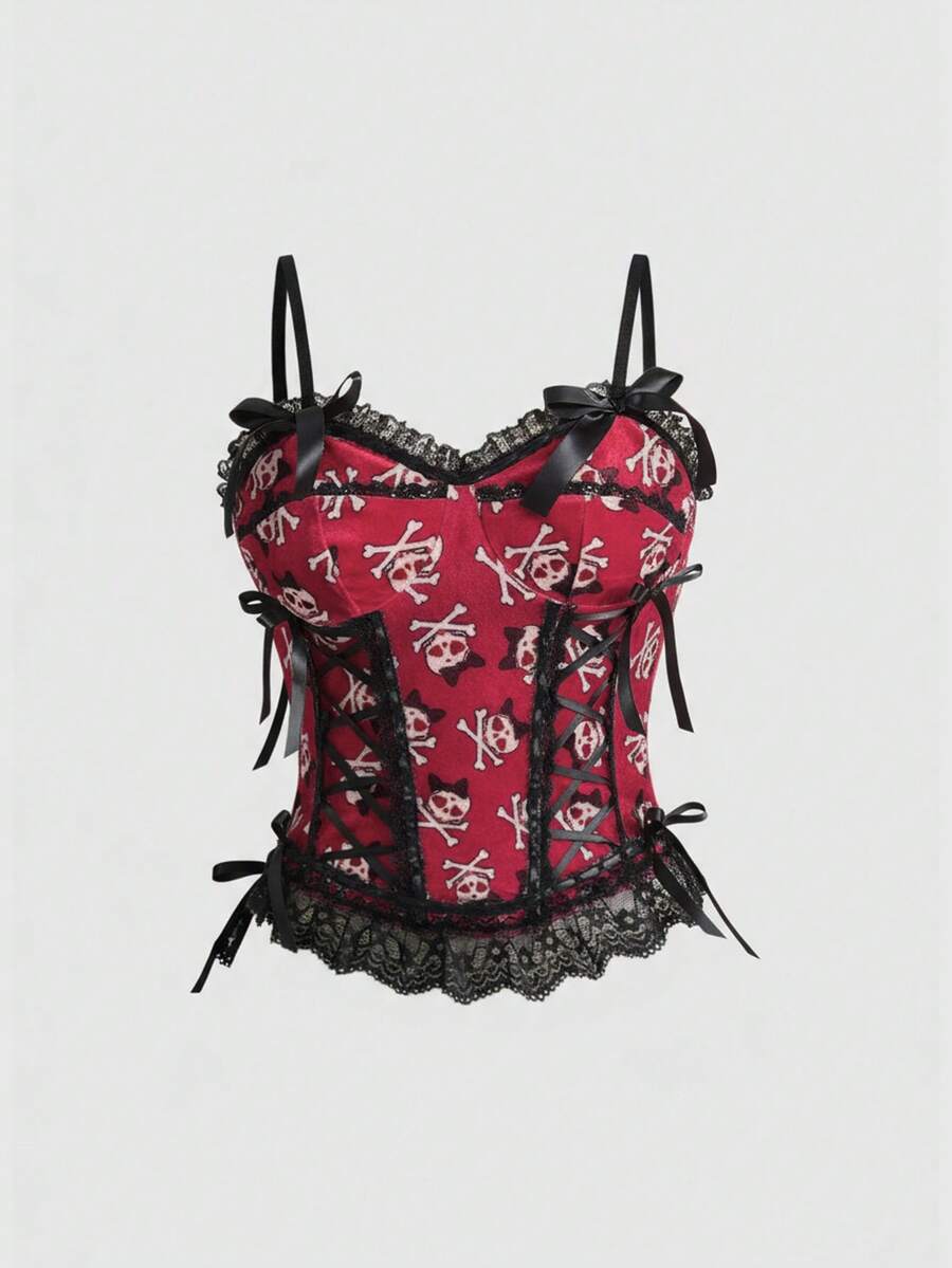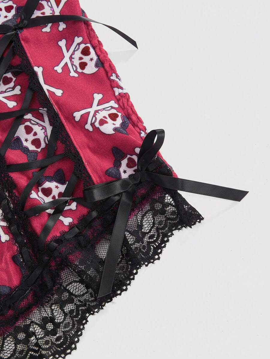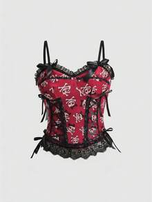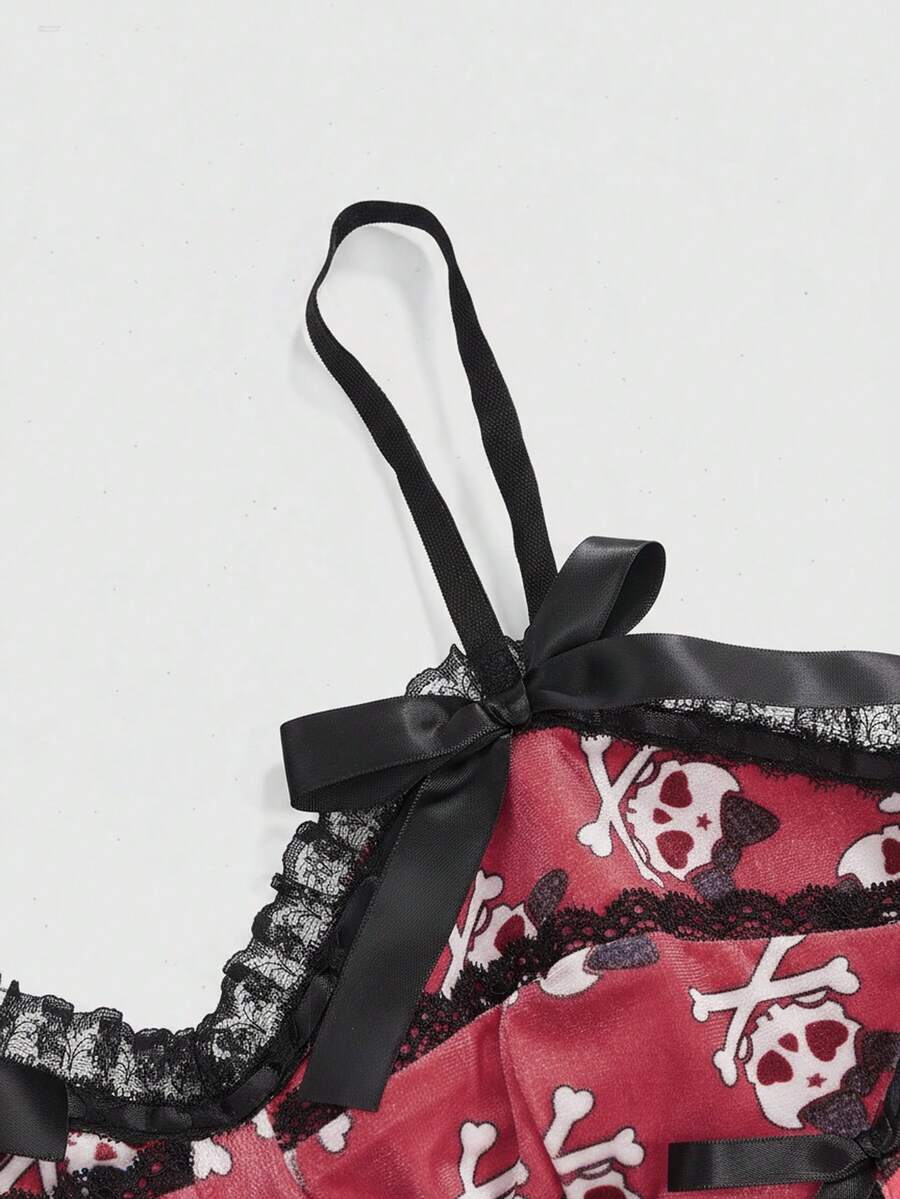 Kawaii توب كامي مزين بالدانتيل والقوس والنقاط والجمجمة بطراز Y2K الجذاب