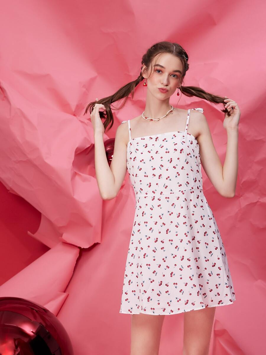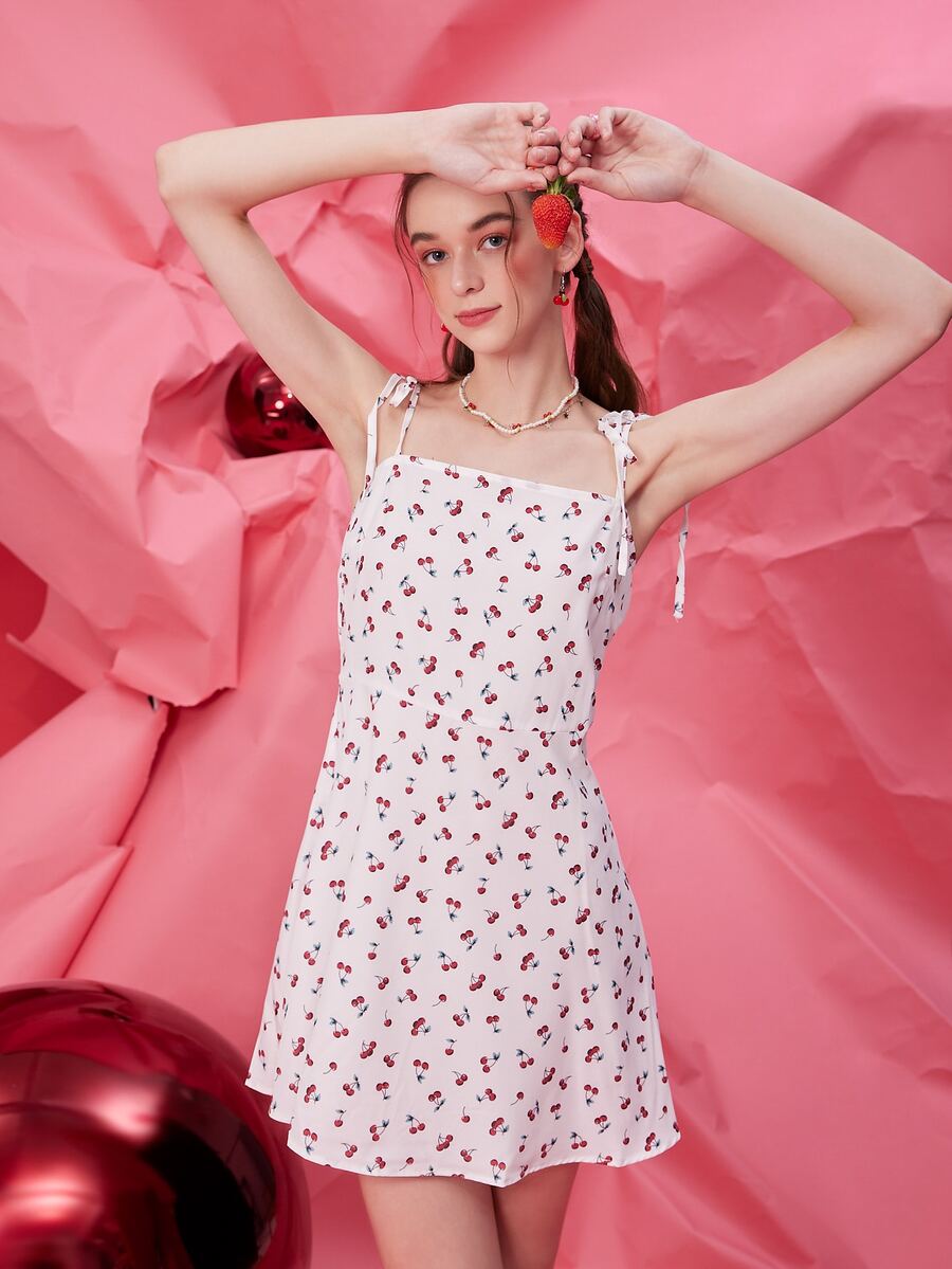 فستان بطباعة كرز مدروز خلفي وبحمالات معقود
