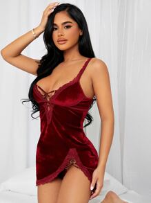 شلحة مقلم دانتيل مخملي مع ثونغ