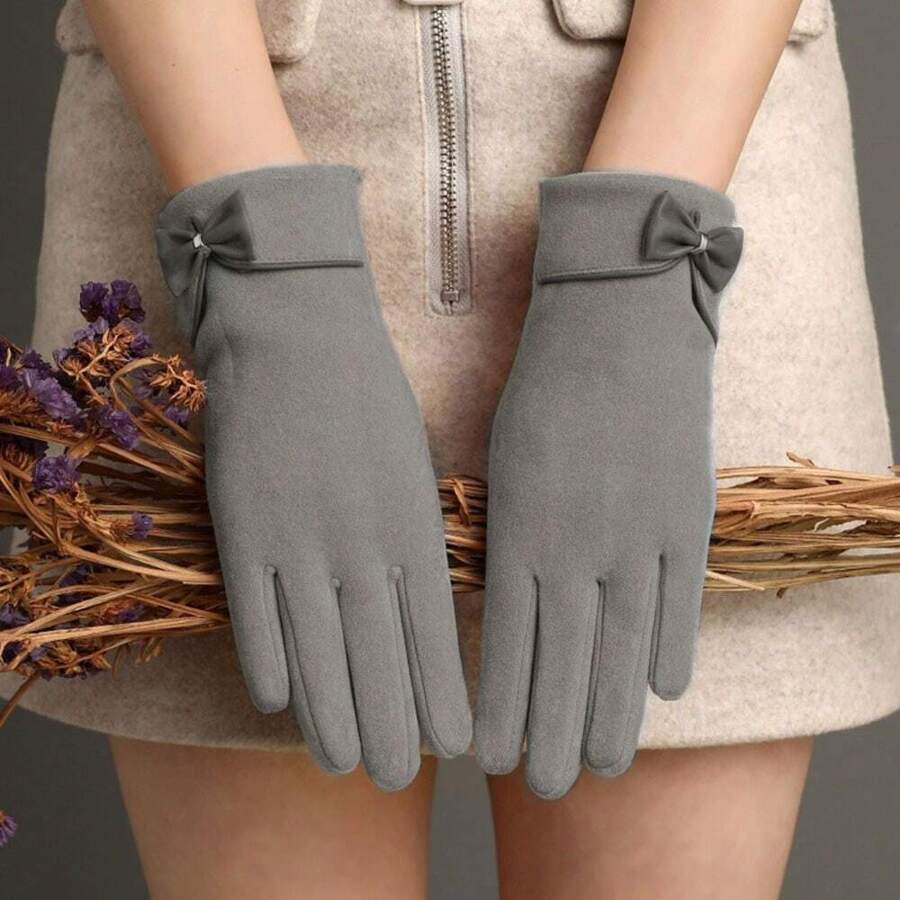 قفازات دافئة عصرية للسيدات مع زخرفة على شكل فيونكة، وظيفة شاشة اللمس، قفازات ركوب الدراجات الرياضية في الهواء الطلق، رمادي
