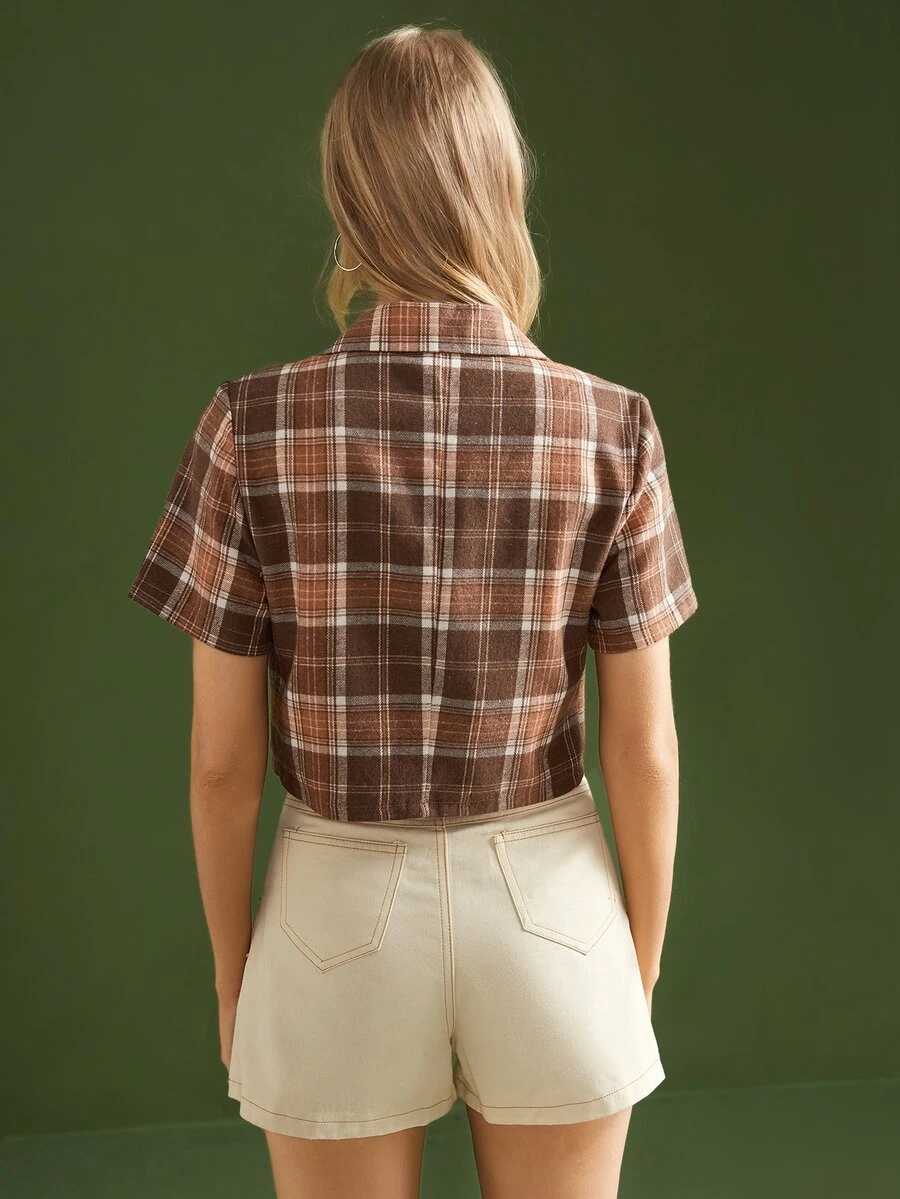 بلوزة قصيرة ياقة مطوي مسنن مربعات ملونة