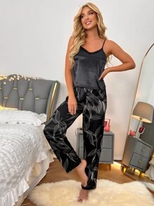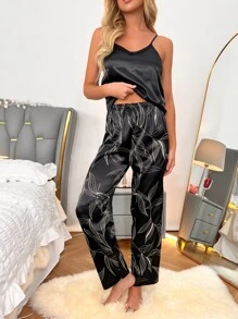 طقم بيجامة ساتان بطباعة الأوراق