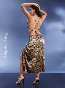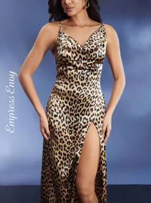 فستان بيجامة حريري ذو شق على الفخذ بطبعة نمر جذاب