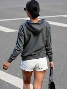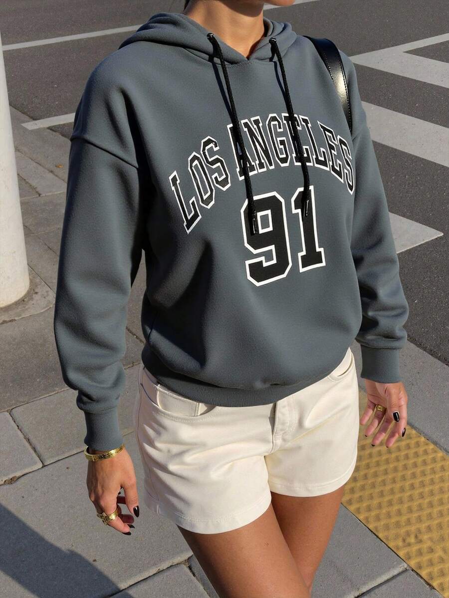 هودي بغطاء للرأس وسحاب وطبعات أحرف، أكمام طويلة