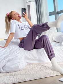طقم منزل تيشيرت بجرافيك عبارة وبنطلون رياضي