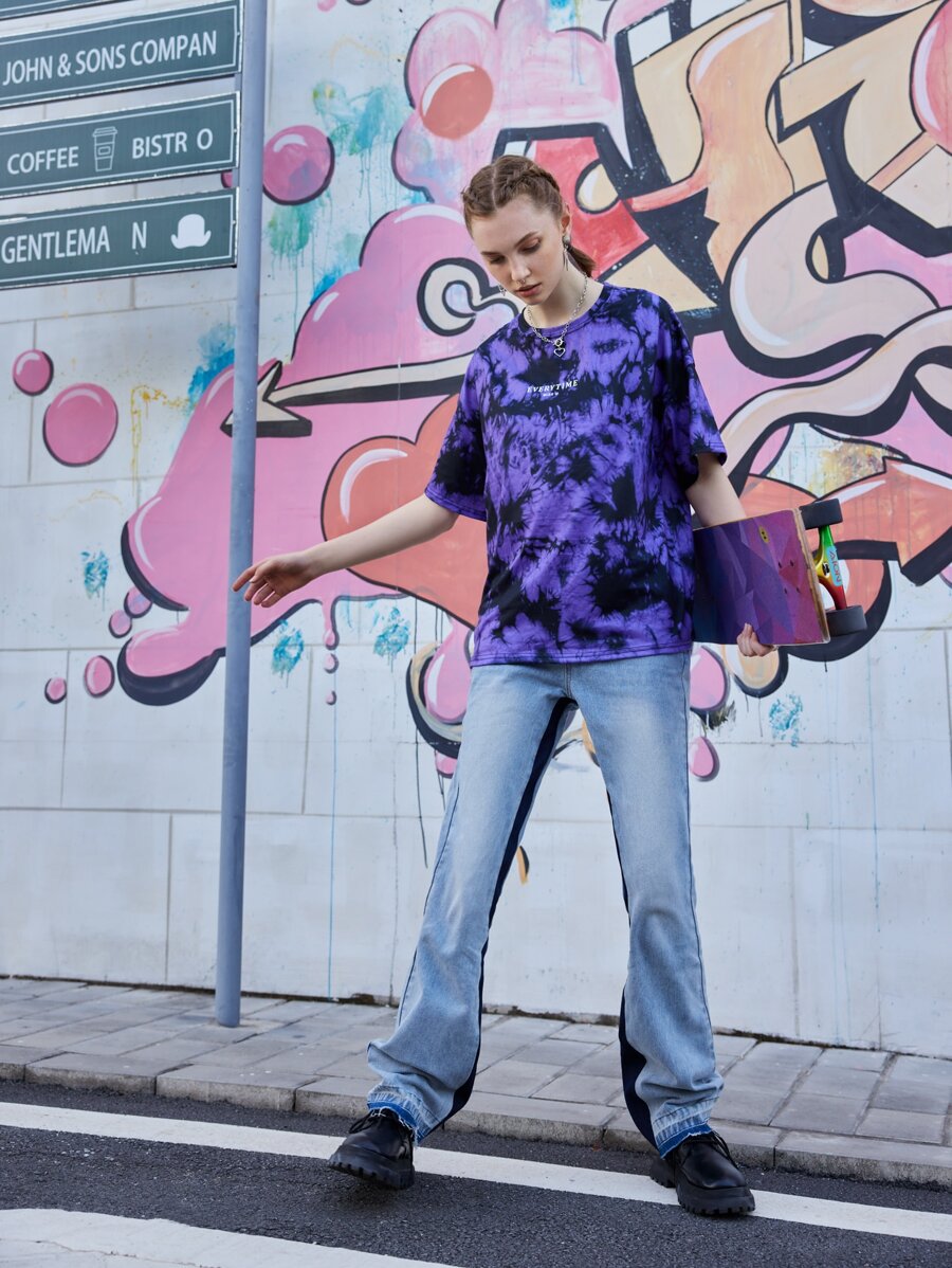 تيشيرت منخفض الاكتاف ببقع ألوان وطباعة عبارة