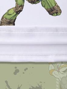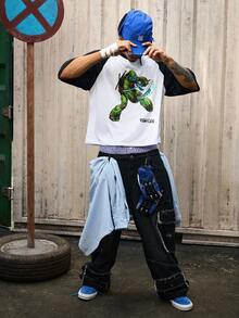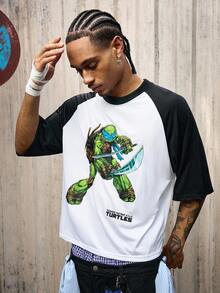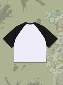 TEENAGE MUTANT NINJA TURTLES X ROMWE قميص تي شيرت رجالي فضفاض بأكمام راجلان بتصميم كرتوني للسلحفاة والحروف بألوان متباينة، موضة الشارع الكاجوال، صيفي