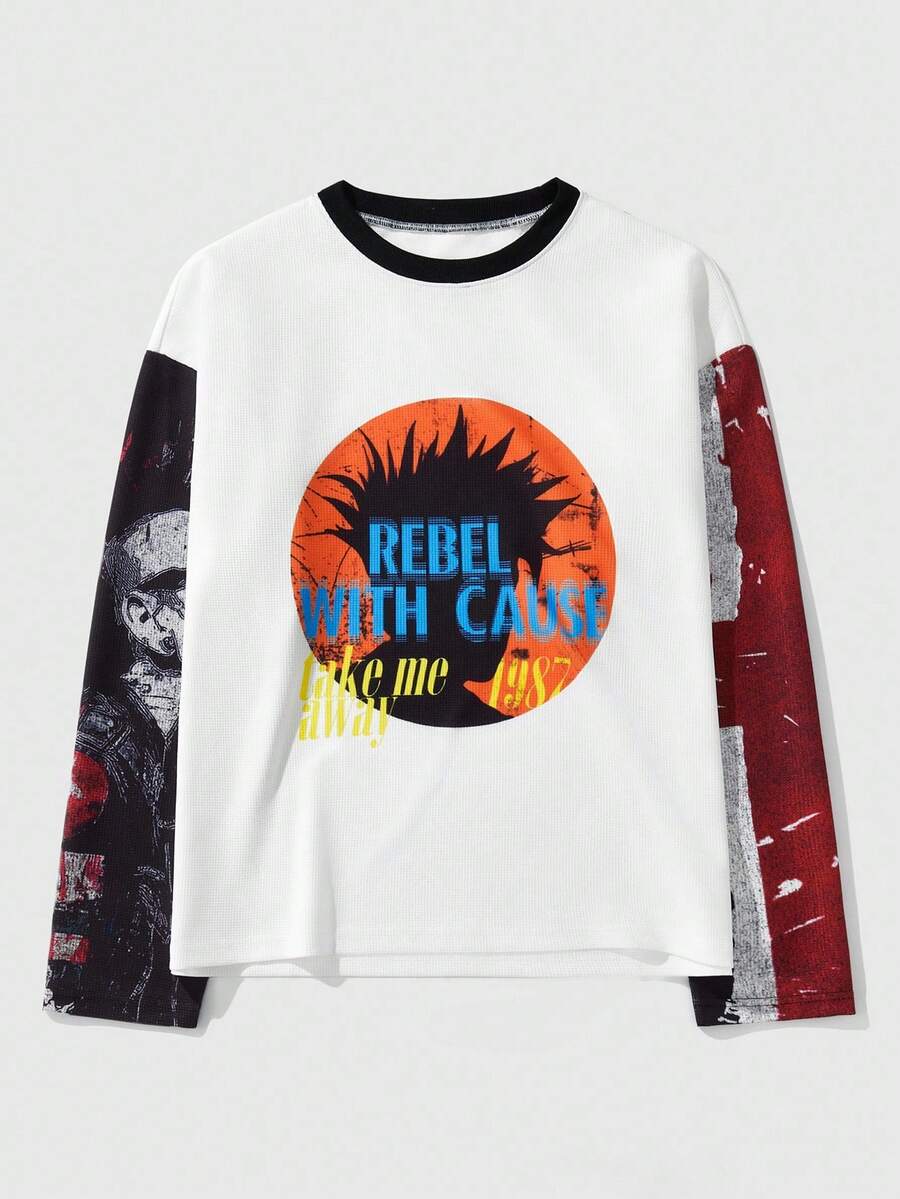 Street Life قميص تي شيرت كاجوال طويل الأكمام مطبوع بشعارات وأشكال ملونة بقصة فضفاضة، للربيع والخريف