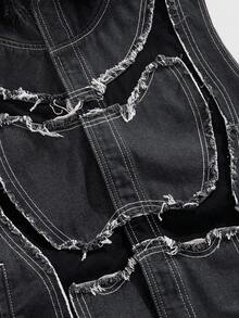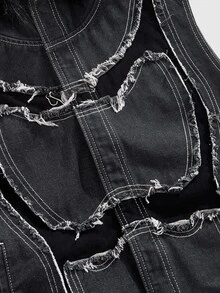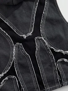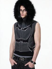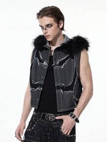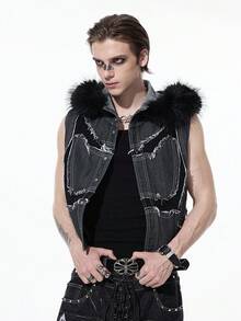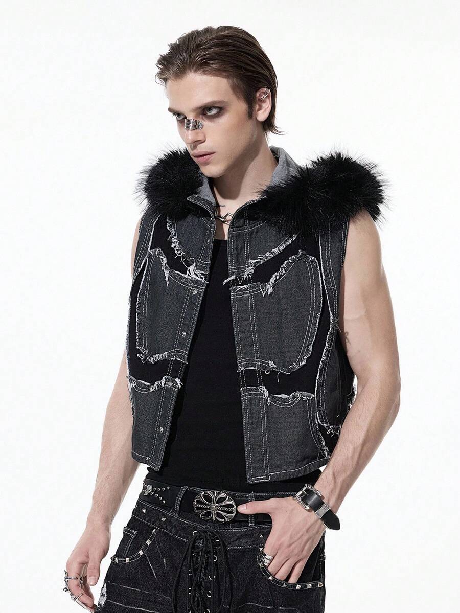 ROMWE Avant جاكيت جينز بغطاء رأس بياقة من الفرو الاصطناعي بتصميم ألوان متباينة للرجال