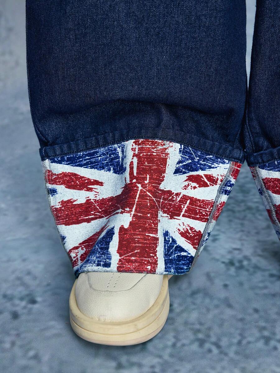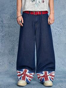 Grunge Punk بنطلون جينز رجالي بفضفاض مع جيوب مطبوعة بالعلم