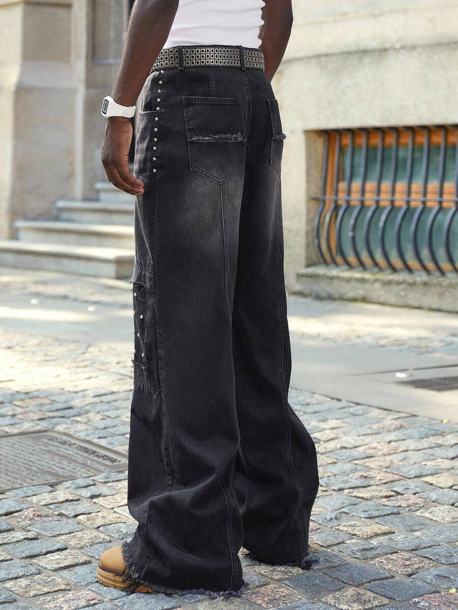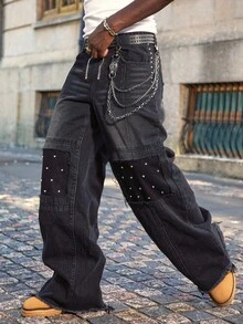 Street Life بنطلون جينز رجالي فضفاض مريح مع جيوب وزخارف من اللؤلؤ، طراز جرانج