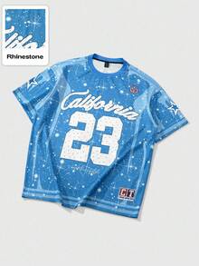Street Life ملابس علوية تي شيرت أكمام قصيرة مطبوع بتصميم كامل مرصع بالراين ستون بطراز رياضي أمريكي، بلوحة رياضية وردية ديناميكية مع نص 'كاليفورنيا' بخط أبيض بارز وأرقام 23 بألوان متباينة مع طراز نجمي'