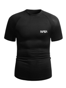 Manfinity Running تي شيرت رياضي قصير الأكمام بنمط صديق بتصميم بسيط، طباعة بلونين، مناسب للمدرسة
