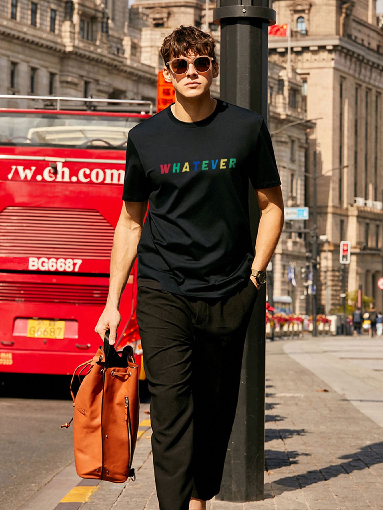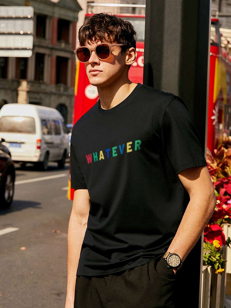 تي شيرت بعنق دائري وبجرافيك عبارة للرجال