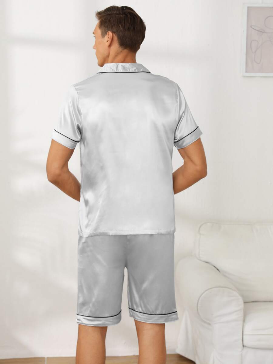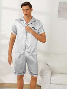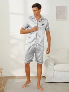 طقم بيجامة بشريط مرقع بعبارة ساتان للرجال