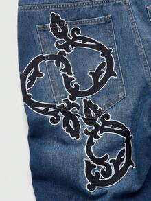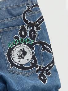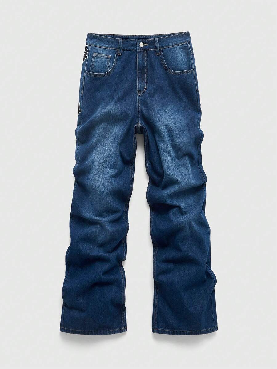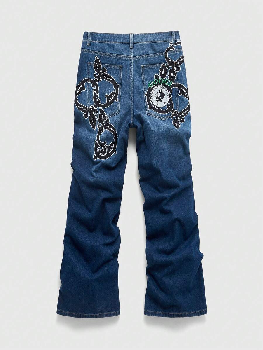 بنطلون جينز رجالي فضفاض بساق واسعة مطرز بحرف