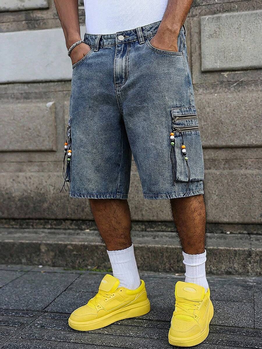 شورتات جينز كاجوال واسعة الساق مع جيوب وسحاب للرجال